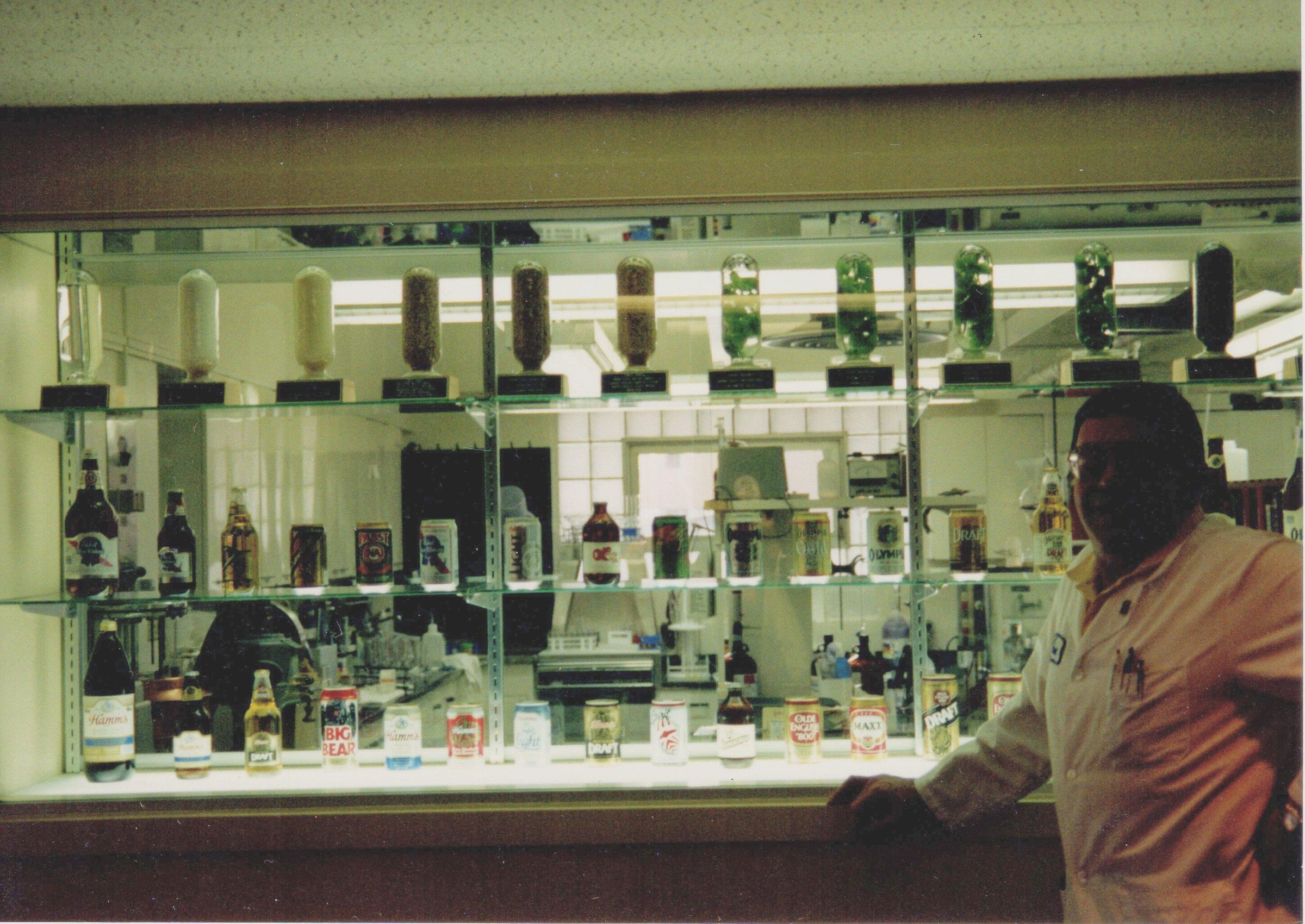 Print, photographic. 5 x 3 1/2 color photo. Shows Frank Deeter, a tour guide at the Olympia Brewing Company, standing in front of a display at the brewery.
