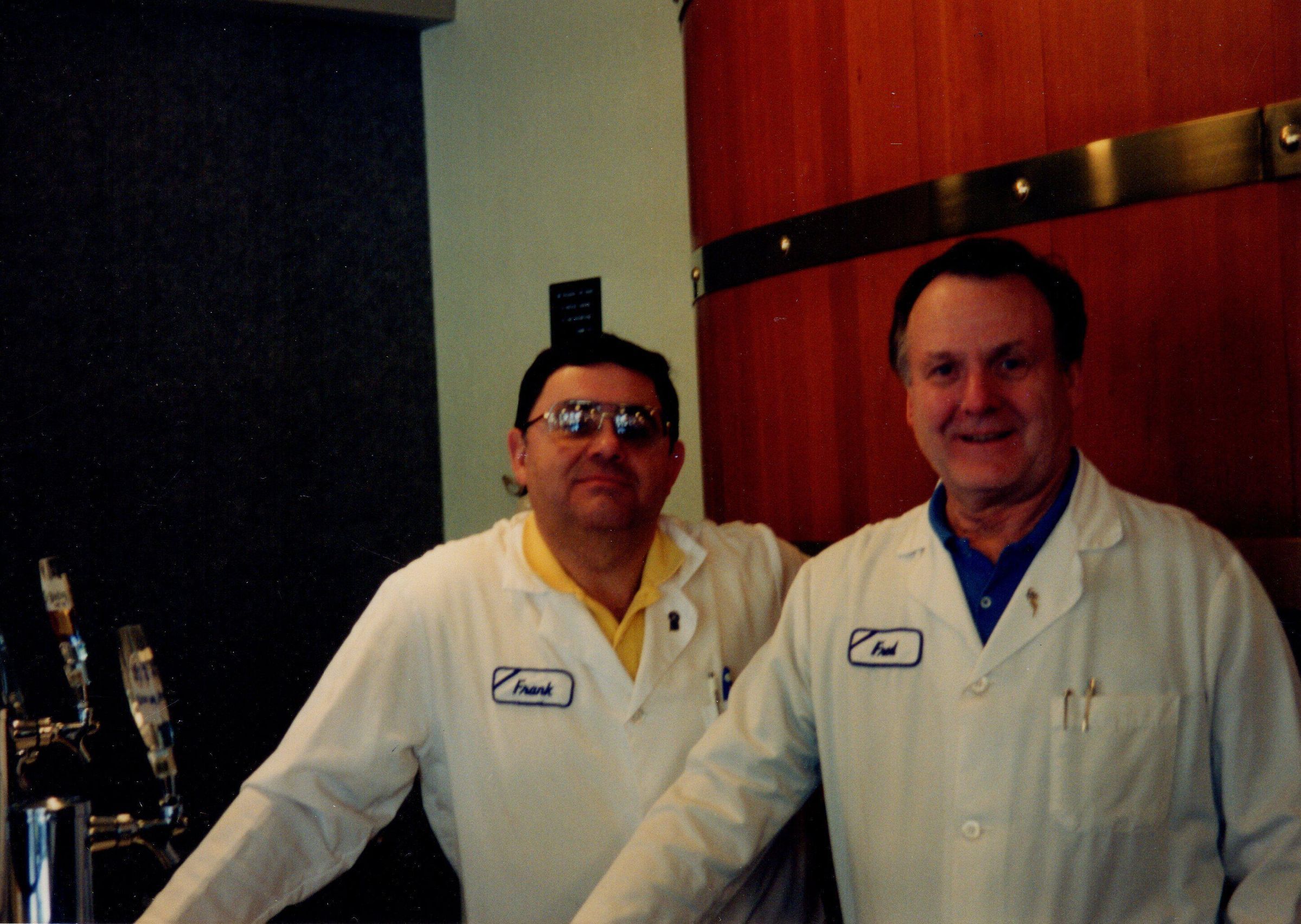 Print, photographic. 5 x 3 1/2 color photo. Shows Frank Deeter and Fred Metcalf, tour guides at the Olympia Brewing Company.