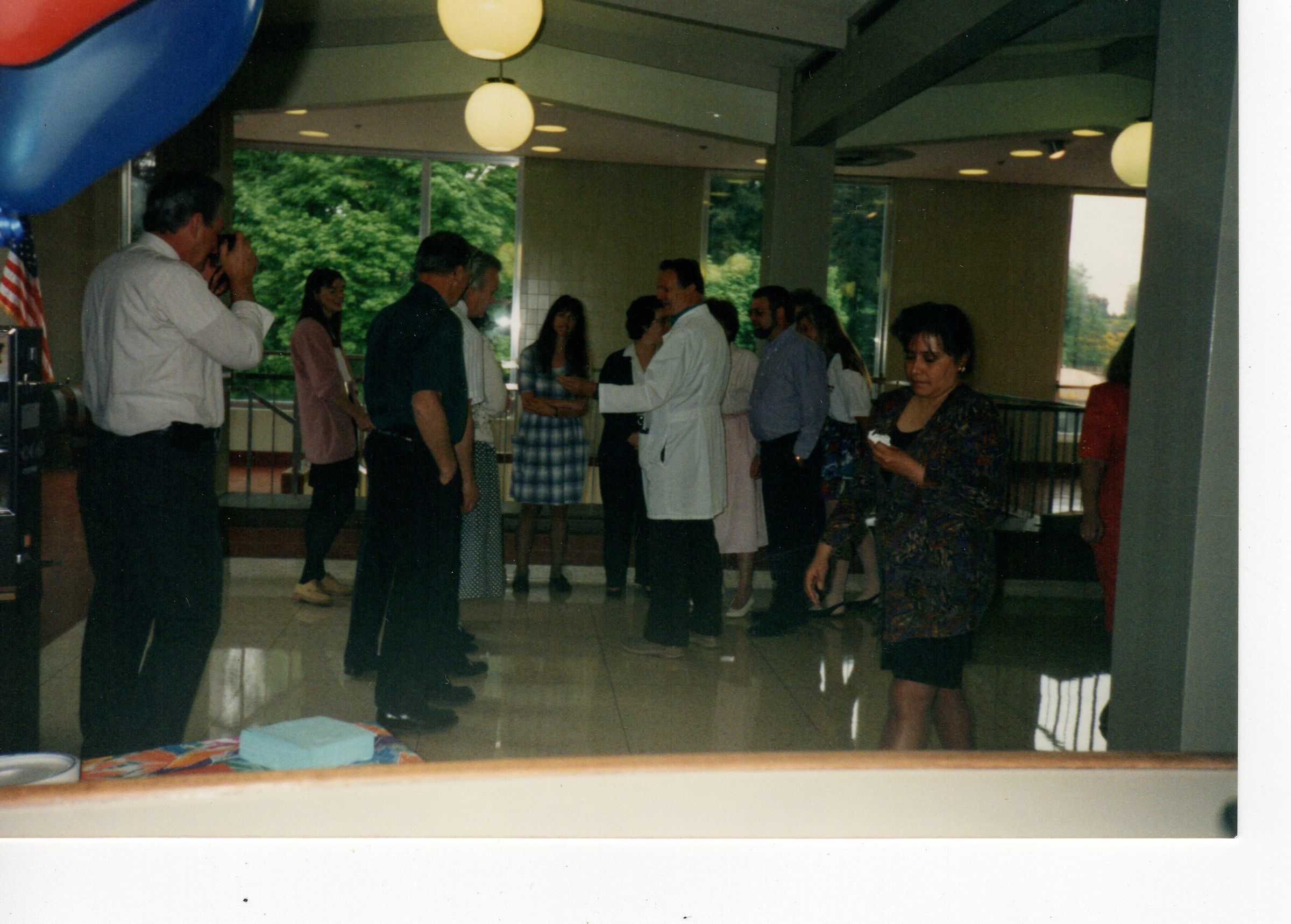 Print, photographic. 6 x 4 color photo. Shows Fred Metcalf, tour guide at the Olympia Brewing Company, probably at an anniversary celebration for him. Several unidentified people with him.