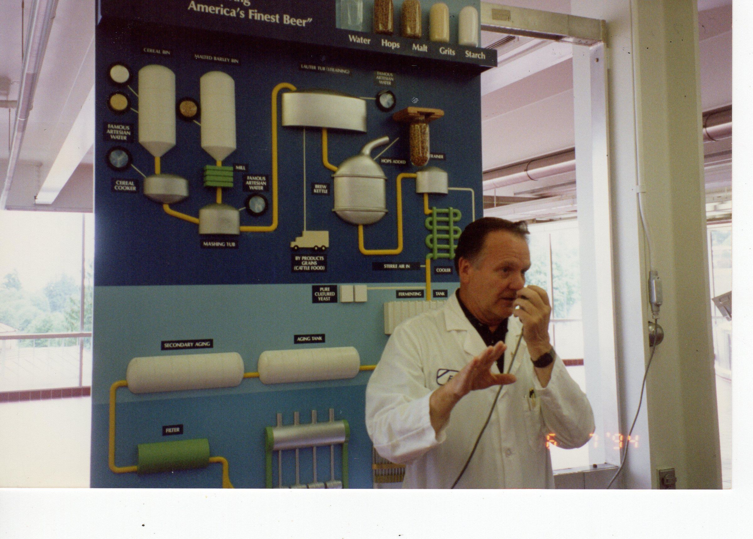 Print, photographic. 6 x 4 color photo. Shows Fred Metcalf, tour guide at the Olympia Brewing Company.