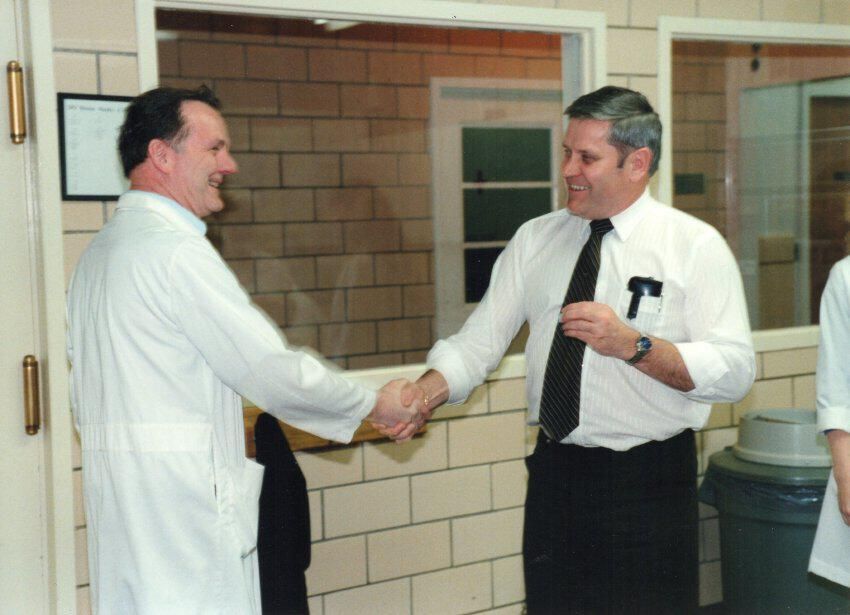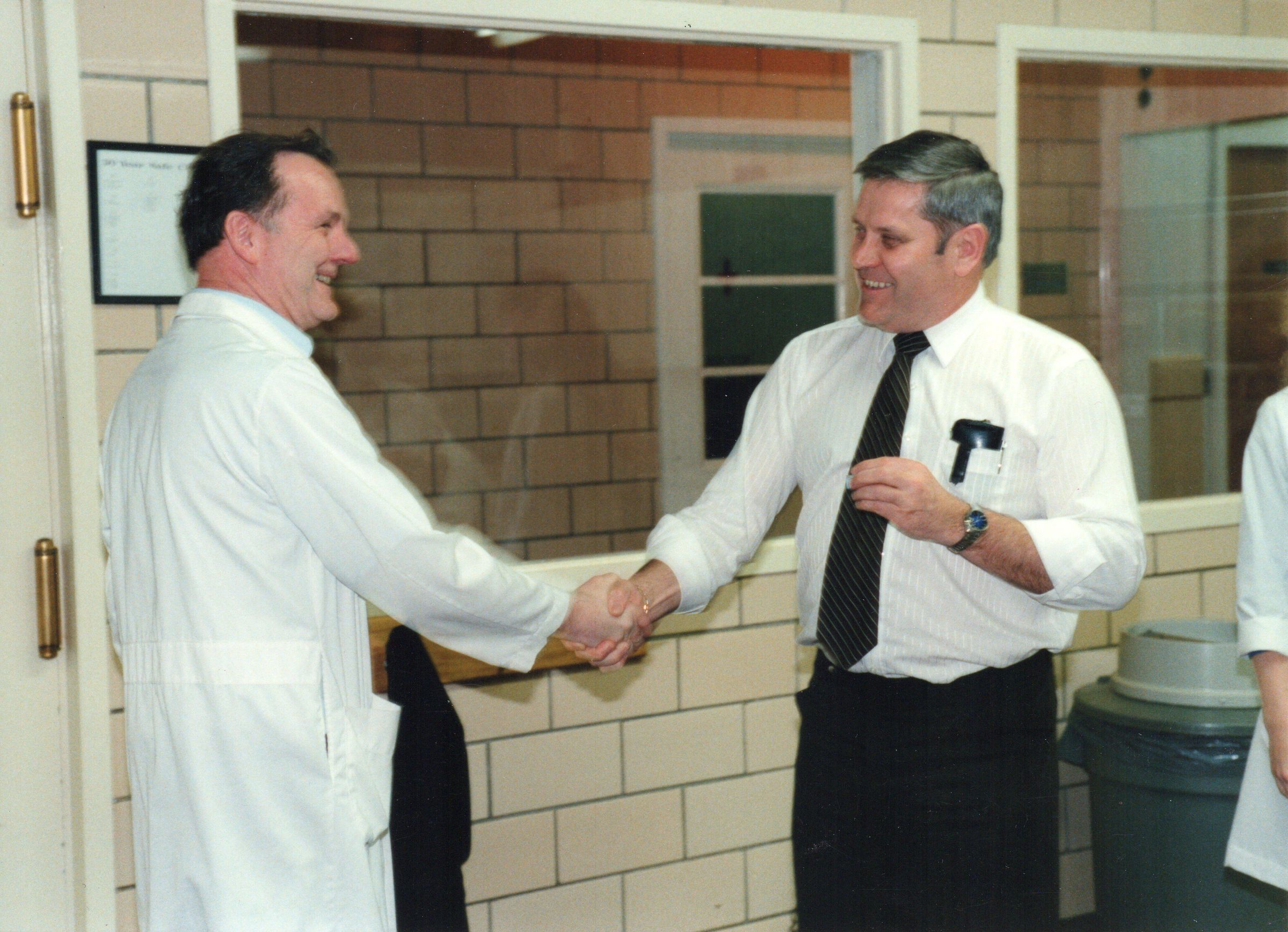 Print, photographic. 7 x 5 color photo. Shows Fred Metcalf, tour guide at the Olympia Brewing Company, with an unidentified man.
