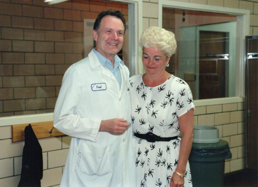Print, photographic. 7 x 5 color photo. Shows Fred Metcalf, tour guide at the Olympia Brewing Company, with an unidentified woman, possibly his wife.