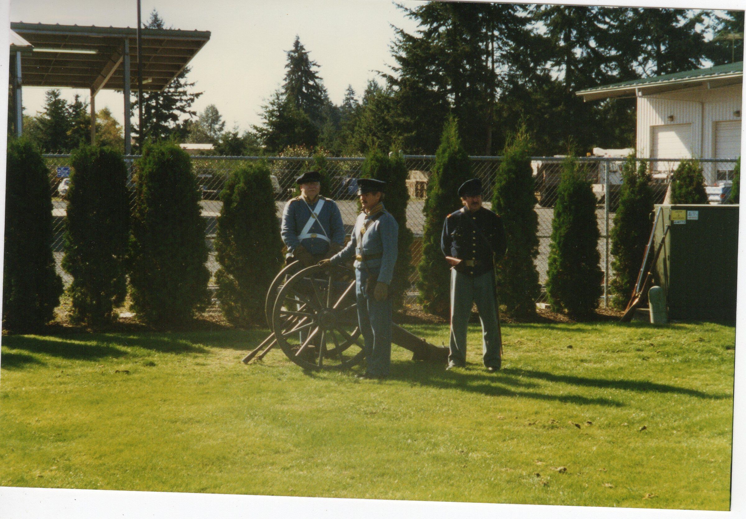 Print, photographic. 5 3/4 x 4 color print. Photo taken during sesquicentennial celebration of Tumwater's founding. Image shows 3 unidentified men in military uniforms, with cannon.