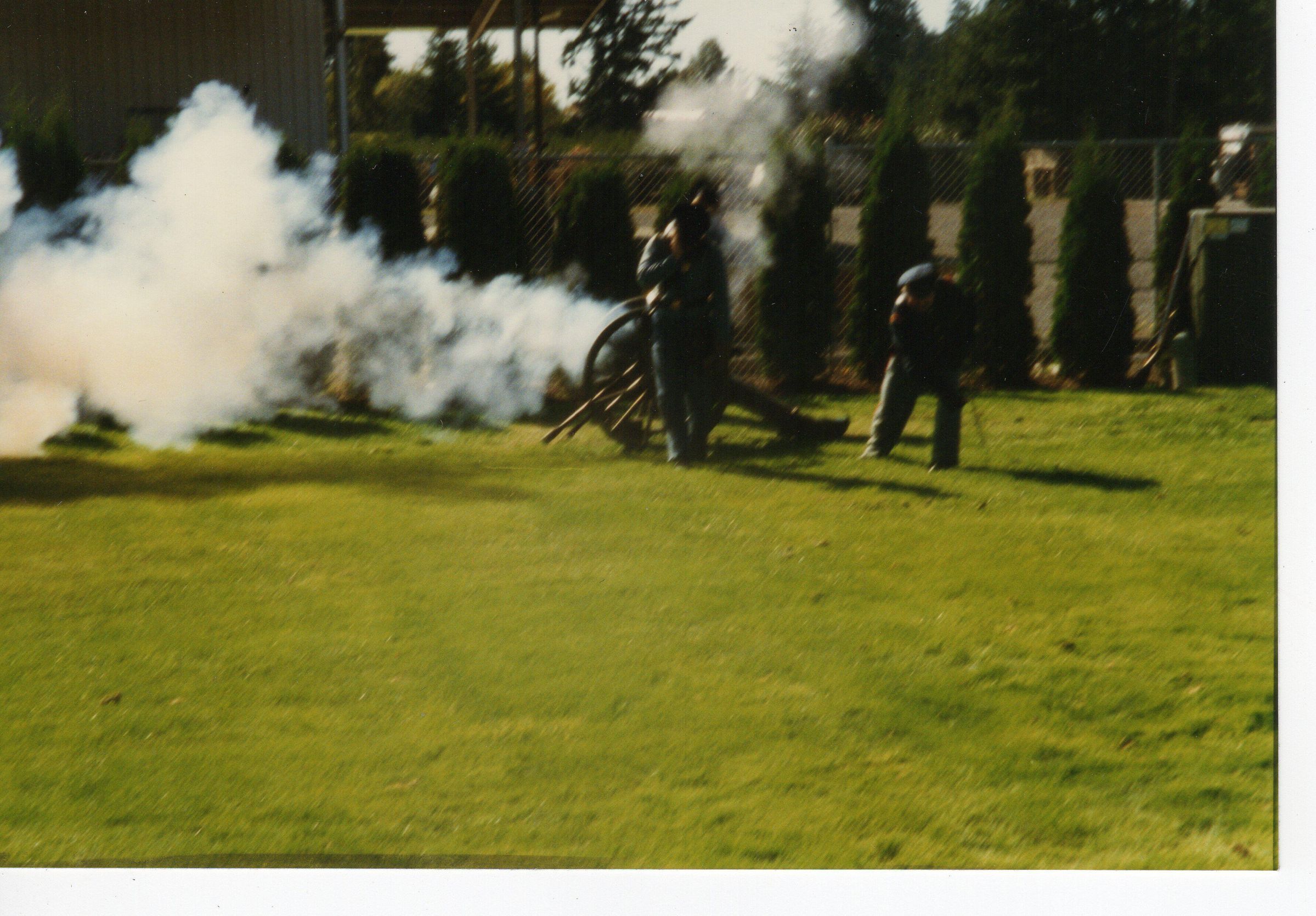 Print, photographic. 5 3/4 x 4 color print. Photo taken during sesquicentennial celebration of Tumwater's founding. Image shows 3 unidentified men in military uniforms, firing cannon.