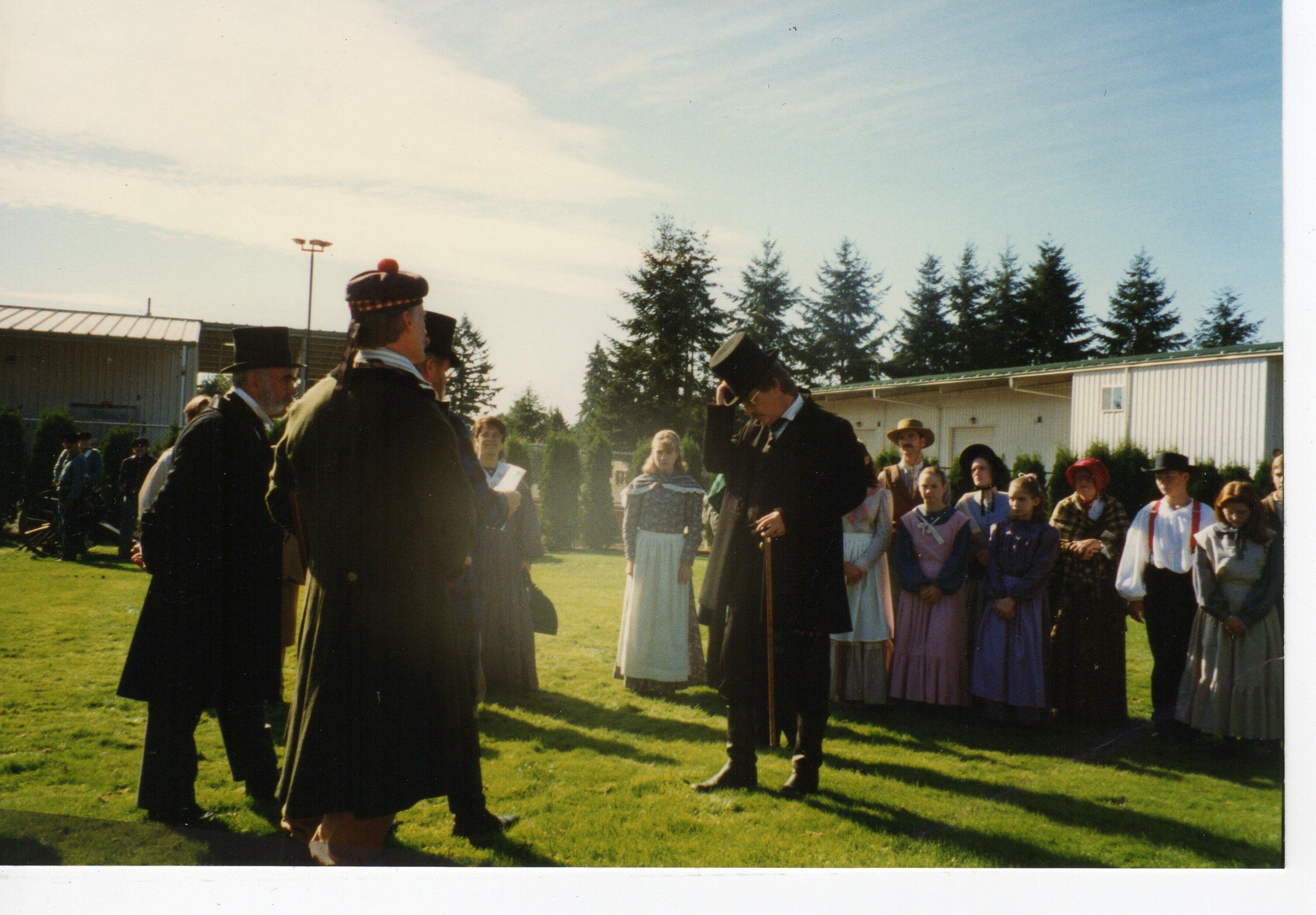 Print, photographic. 5 3/4 x 4 color print. Photo taken during sesquicentennial celebration of Tumwater's founding. Image shows crowd of people, in period attire. Group at right are students from the Tumwater Middle School Homesteader program.Name/Title