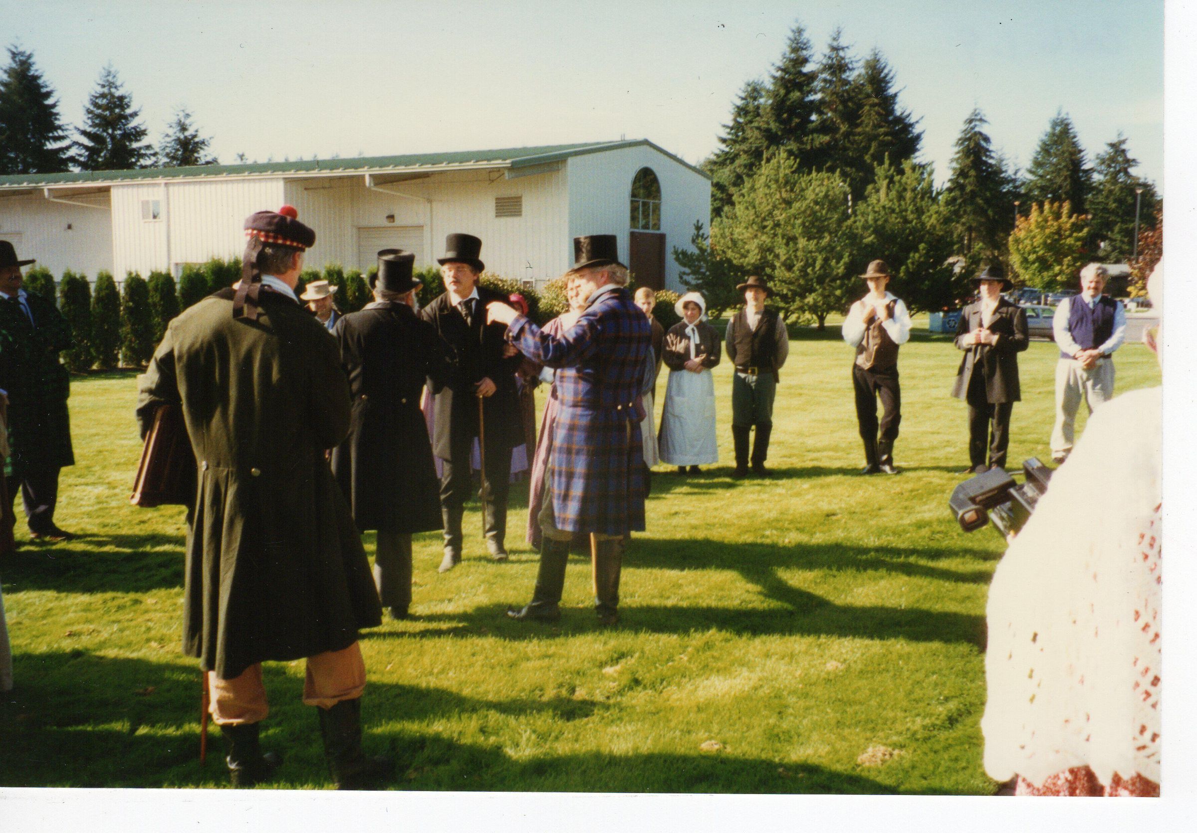 Print, photographic. 5 3/4 x 4 color print. Photo taken during sesquicentennial celebration of Tumwater's founding. Image shows crowd of people, most in period attire. Some are students with the Tumwater Middle School Homesteader program. Man at far right is Don Trosper.Name/Title