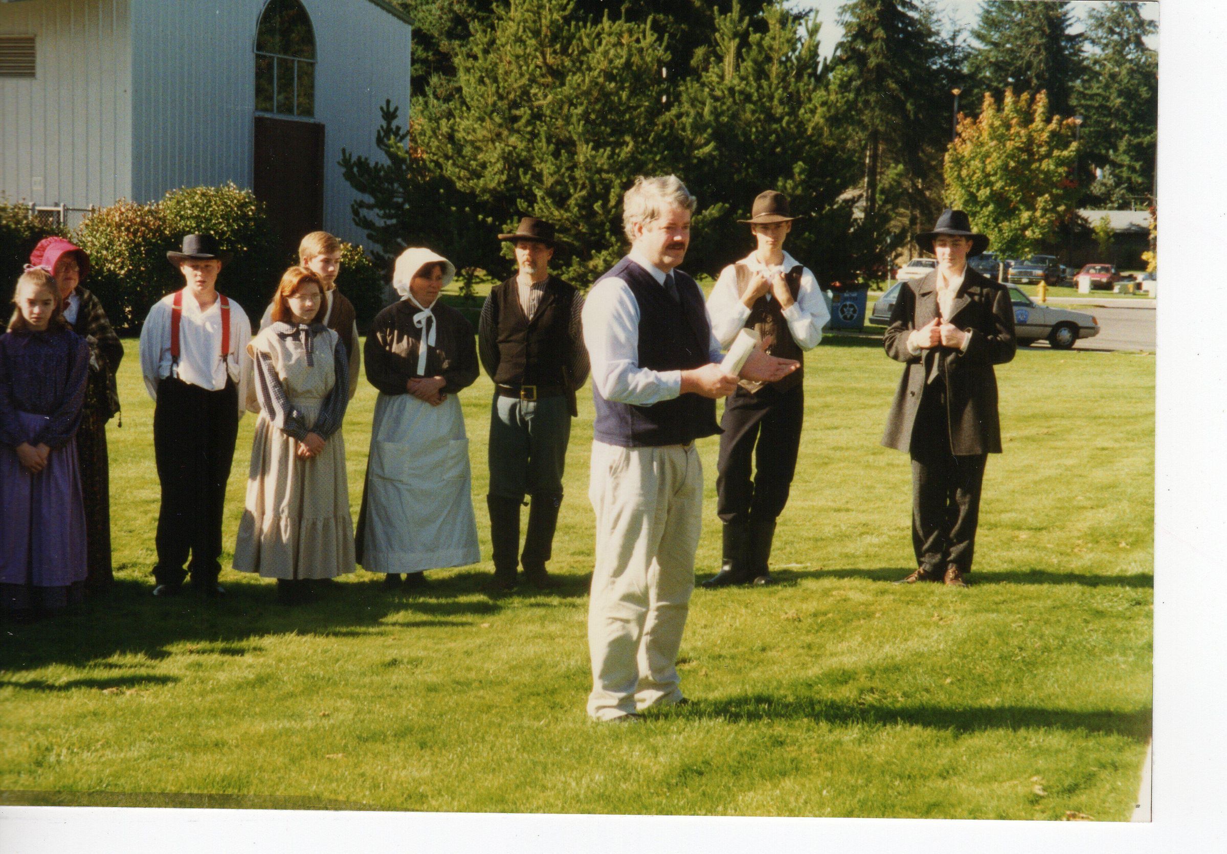 Print, photographic. 5 3/4 x 4 color print. Photo taken during sesquicentennial celebration of Tumwater's founding. Image shows crowd of people, most in period attire. Students are with the Tumwater Middle School Homesteader program. Man at center is Don Trosper.Name/Title
