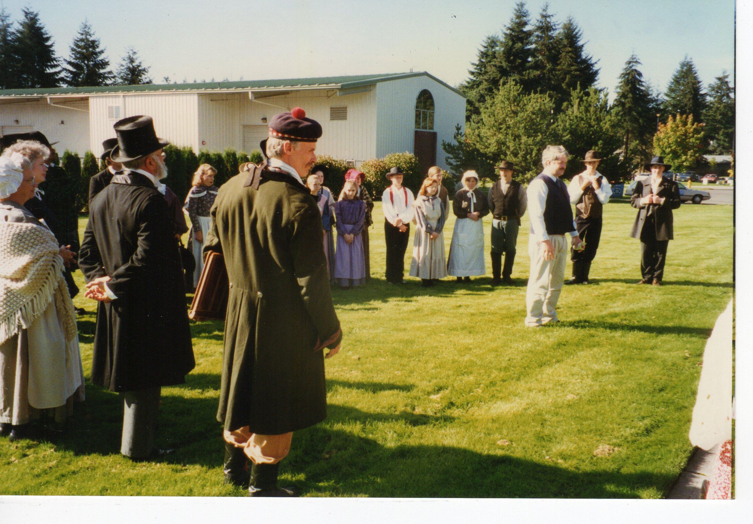 Print, photographic. 5 3/4 x 4 color print. Photo taken during sesquicentennial celebration of Tumwater's founding. Image shows crowd of people, most in period attire. Students are with the Tumwater Middle School Homesteader program. Man at center is Don Trosper.Name/Title
