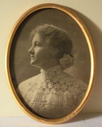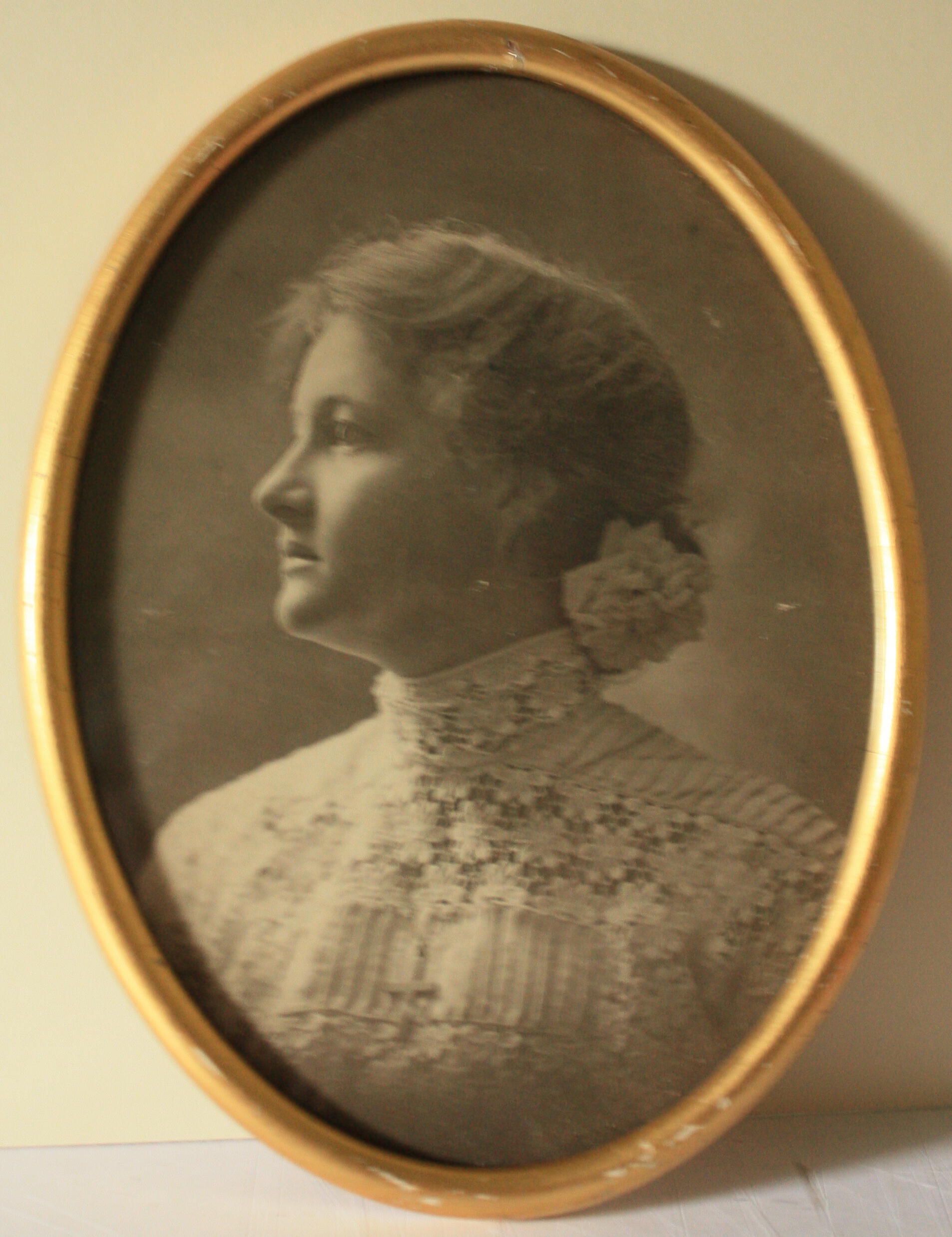 Photograph. 5 3/4 x 7 3/4 oval, b&w image, in oval gold-toned metal frame, 6 1/4 x 8 1/2 overall. Portrait of young woman in lace dress, rose in hair, cross necklace. The person who donated this photo labeled it "Louise Barksdale Parker," but there is no known Schmidt relative of this name. It is probably a photo of Louise Barksdale, who married Leopold Schmidt Jr., and was the mother of Louise and Mildred Schmidt. (Mildred Schmidt later married a man named Parker.) Style of hair and dress points to a portrait taken before the daughters were born.Name/Title