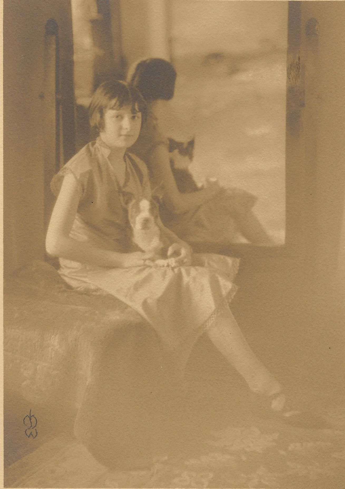 Photograph. 7 1/2 x 9 1/2 sepia. Photo of Mildred Schmidt, age 13 years, holding dog on her lap. Dog is identified as Boots, age 6 months.