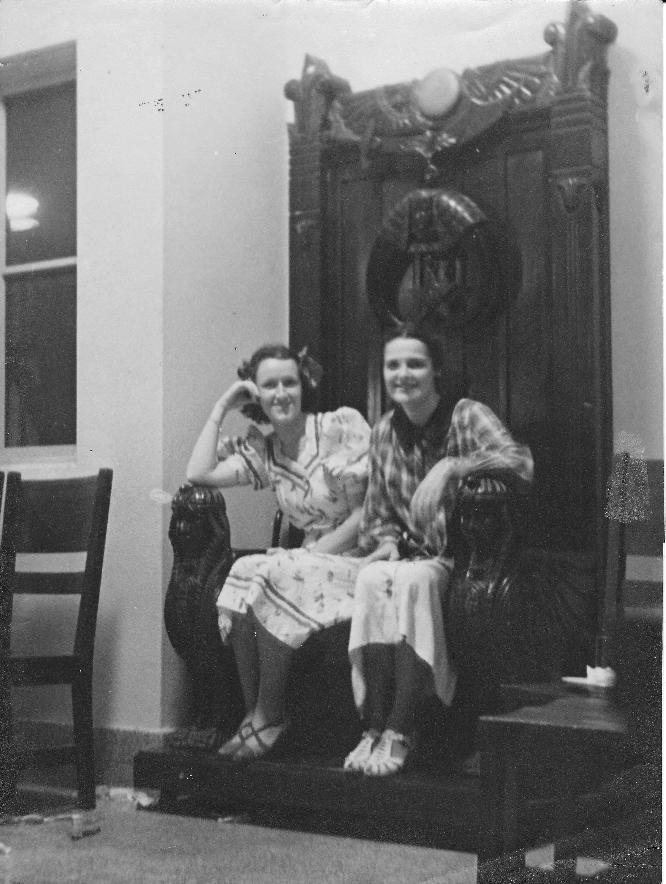 Photograph.7 1/2 x 10 b&w. Photo of two unidentified teen-age girls, sitting in a throne-type chair. Girl on left may be Louise Schmidt. Girl on right is probably Mildred Schmidt.