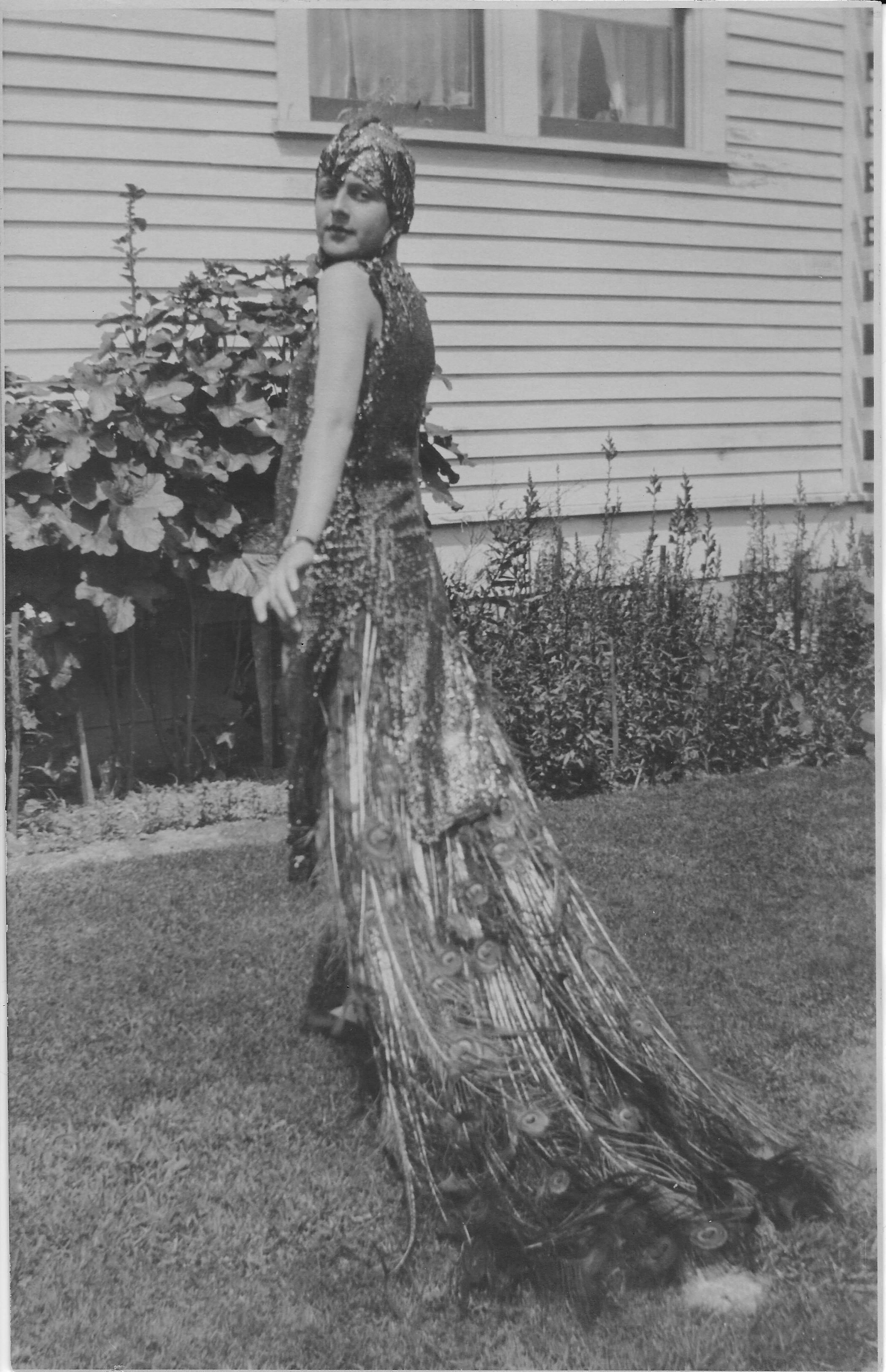 Photograph. 7 x 11 sepia. Photo of Mildred Schmidt, June 1926, age 13 years 11 months. Dressed in a costume trimmed with peacock feathers, for the Lincoln School pageant.