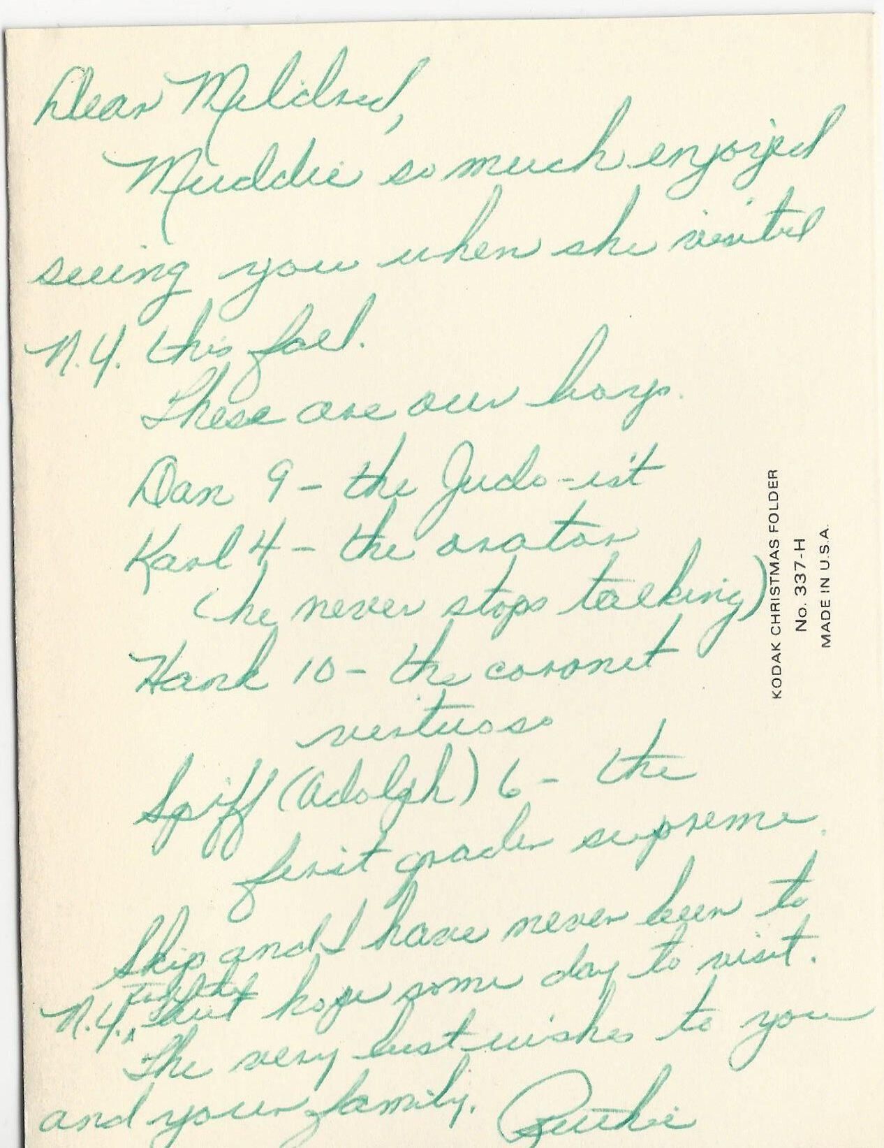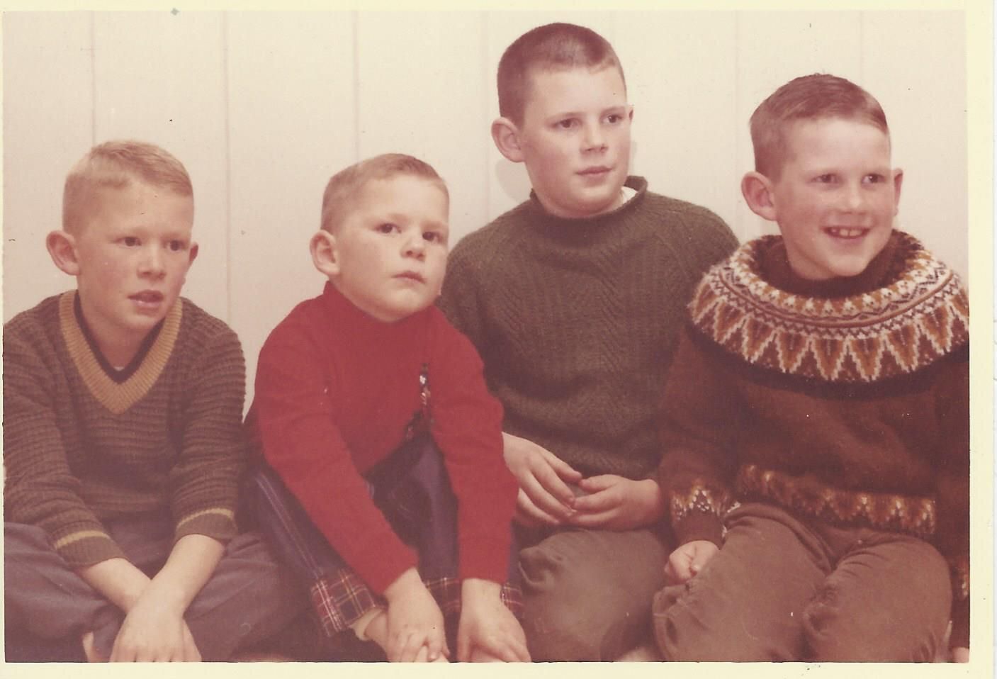 Photograph. 4 1/2 x 3, color, in 5 1/4 x 4 Christmas card enclosure. Portrait of 4 sons of Philip "Skip" and Ruth Schmidt. left to right: Daniel "Dan", Karl, Philip Jr. "Hank", and Adolph "Spiff."