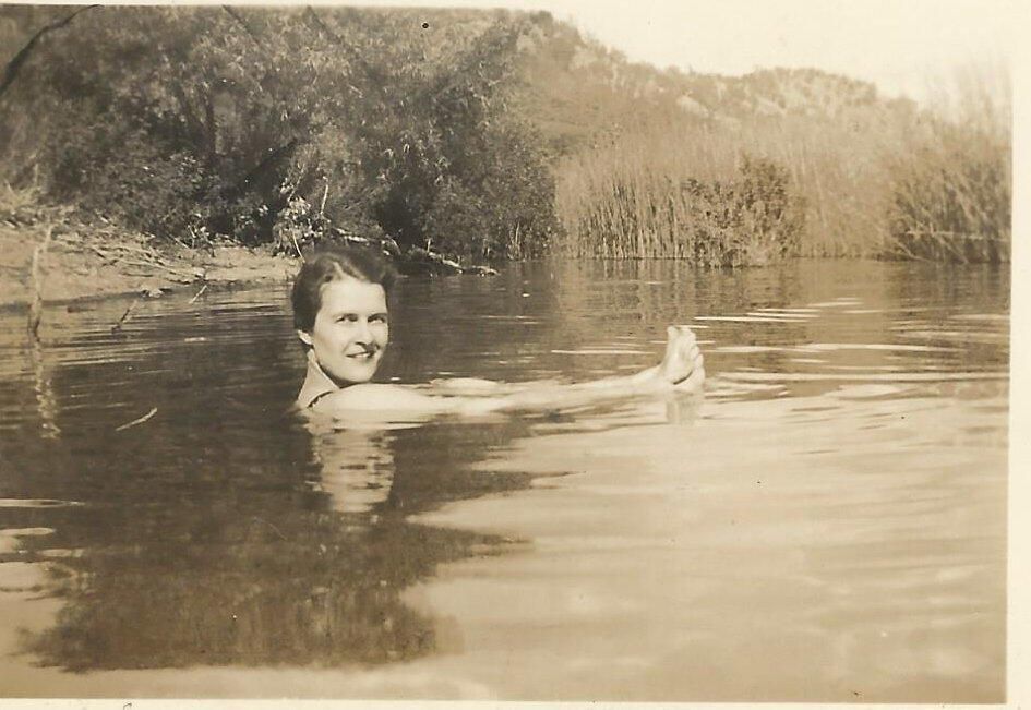 Photograph. 3 x 2 1/4 sepia. Young woman swimming in lake or river. Woman is either Mildred or Louise Schmidt.