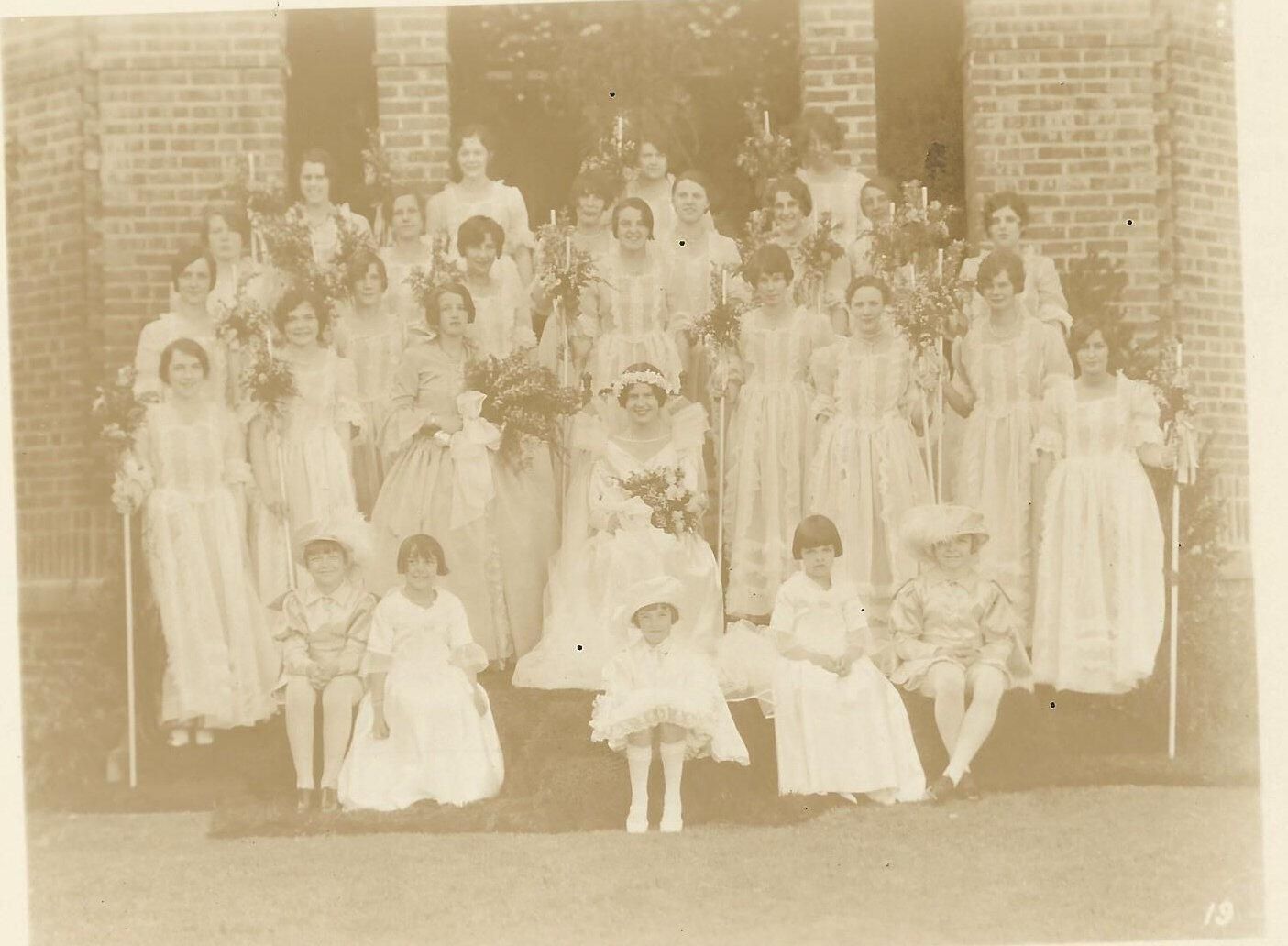 Photograph. 5 x 4 sepia. Group of 23 women and 5 children, possibly a bride and her attendants (from a very large wedding!). No identification of people or location. One of the young women may be Mildred or Louise Schmidt.Name/Title