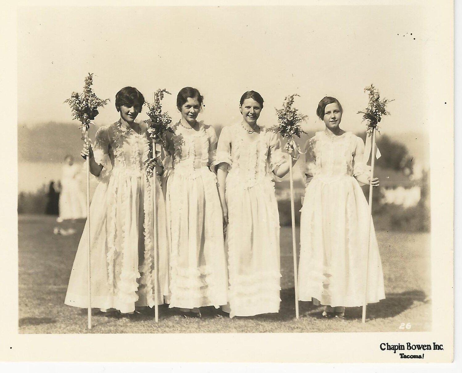 Photograph. 5 x 4 sepia. Group of 4 girls in white dresses, holding staffs decorated with leaves and flowers. Same outfits as worn in 2016.5.29. No ID on girls or location. One of the girls may be Mildred or Louise Schmidt.Name/Title