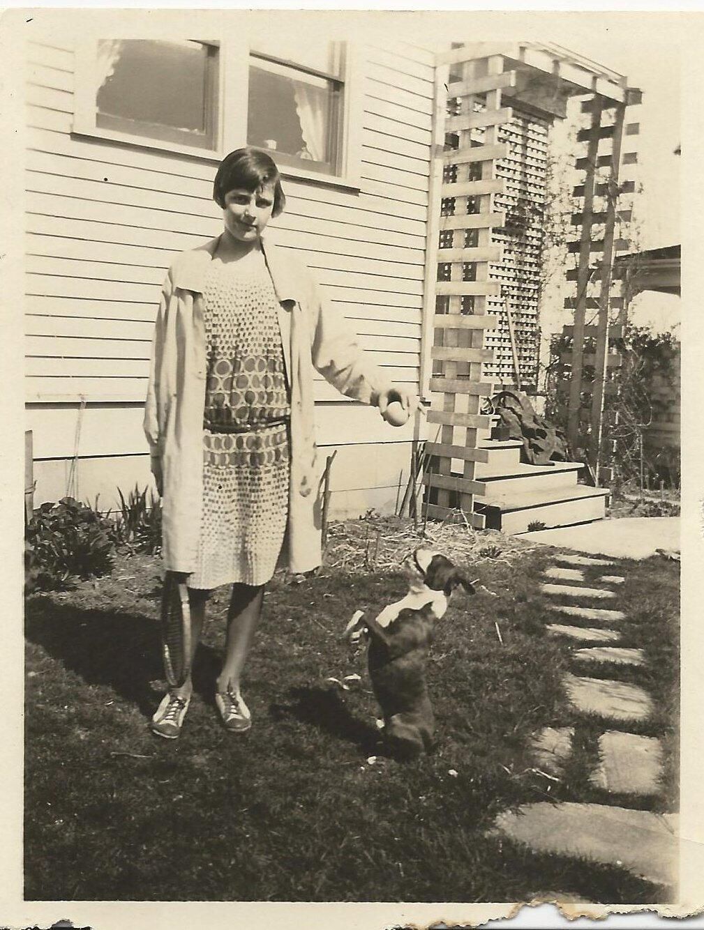 Photograph. 3 1/2 x 4 1/2 b&w. Girl standing outside a house, with small dog. Probably Mildred Schmidt with her dog Boots (see 2016.5.14).