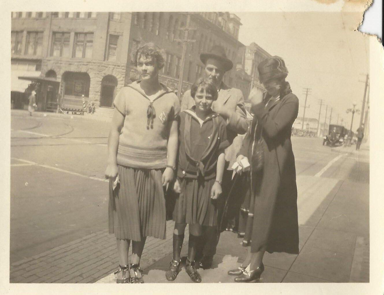 Photograph. 4 1/2 x 3 1/2 b&w. Two girls, woman and man standing on a sidewalk with large building in background. No ID on people or location, but this is likely, left to right: Louise Schmidt, Mildred Schmidt, Leopold Schmidt Jr. and Louise Barksdale Schmidt.Name/Title