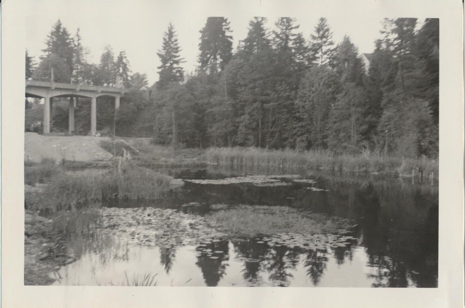 Print, photographic. 5 x 3 1/2 b&w. Construction of can line and warehouse on east side of main brewery and Carlyon Bridge. Area to be filled. May 18, 1953.
