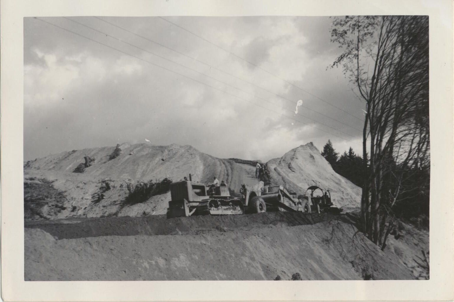 Print, photographic. 5 x 3 1/2 b&w. Construction of can line and warehouse on east side of main brewery and Carlyon Bridge. Bulldozers with pile of fill material. May 18, 1953.
