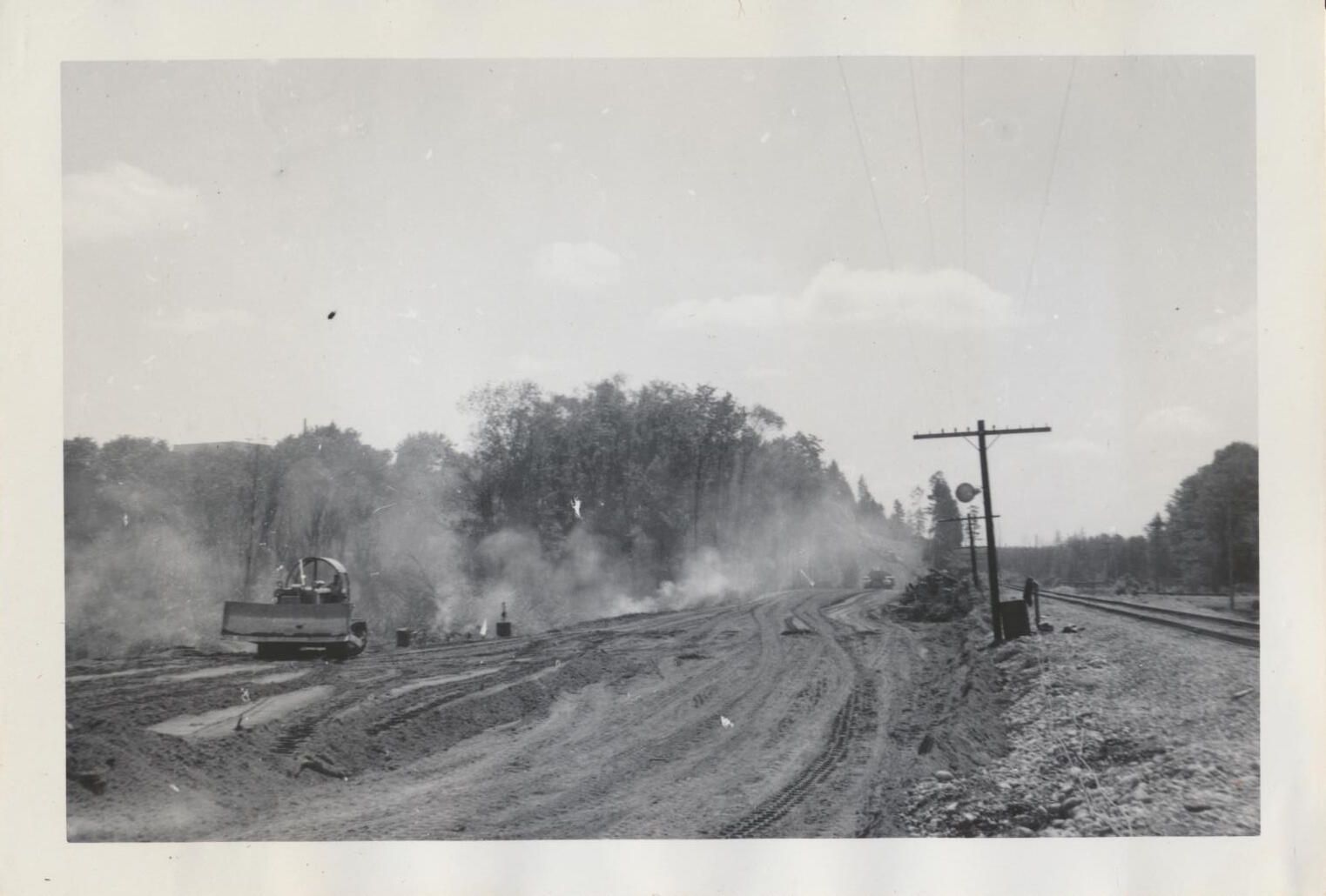 Print, photographic. 5 x 3 1/2 b&w. Construction of can line and warehouse on east side of main brewery and Carlyon Bridge. Road grader working fill along railroad track. June 5, 1953.