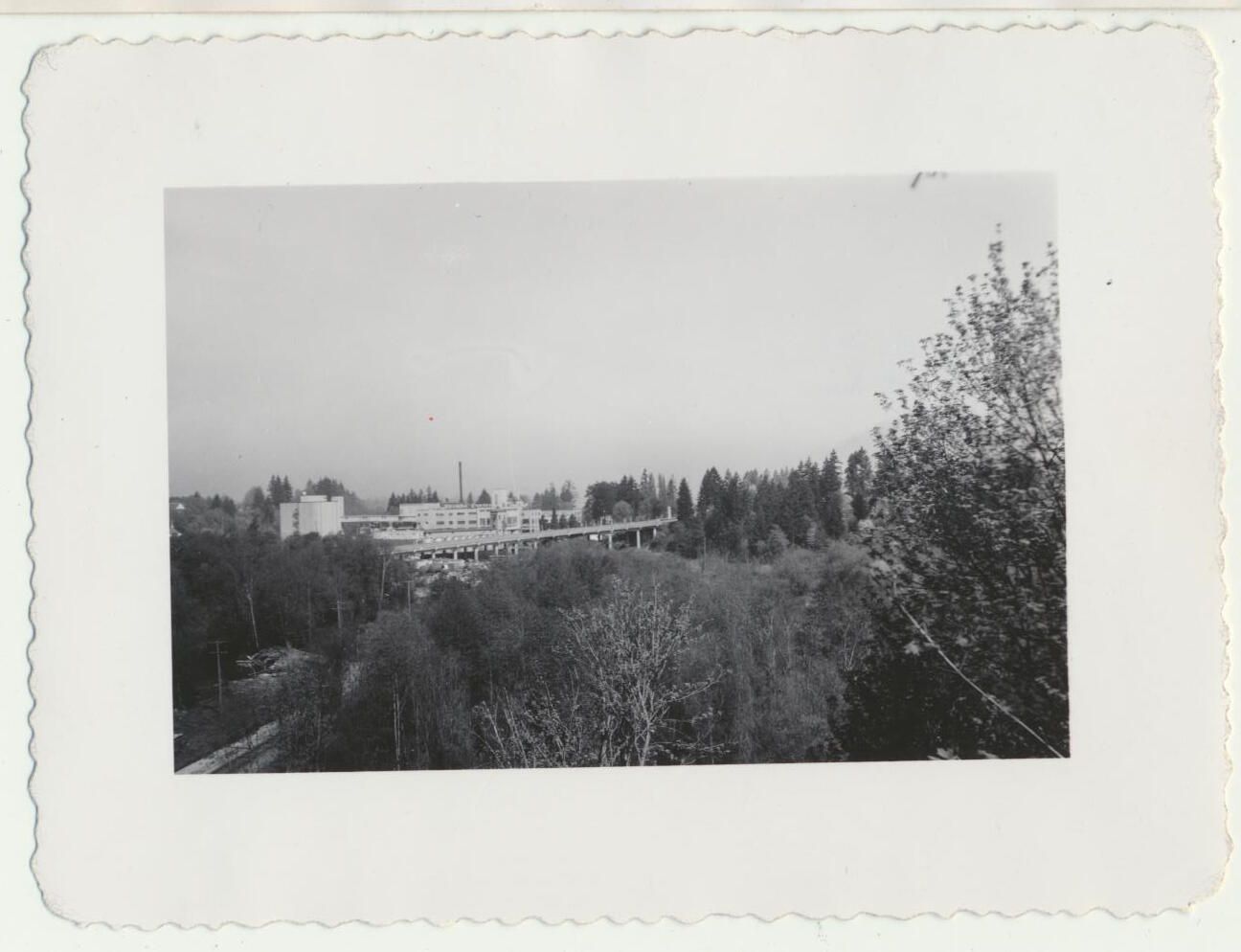 Print, photographic. 4 x 3 b&w. Construction of can line and warehouse on east side of main brewery and Carlyon Bridge. View of brewery from Chambers Point. May 5, 1953.