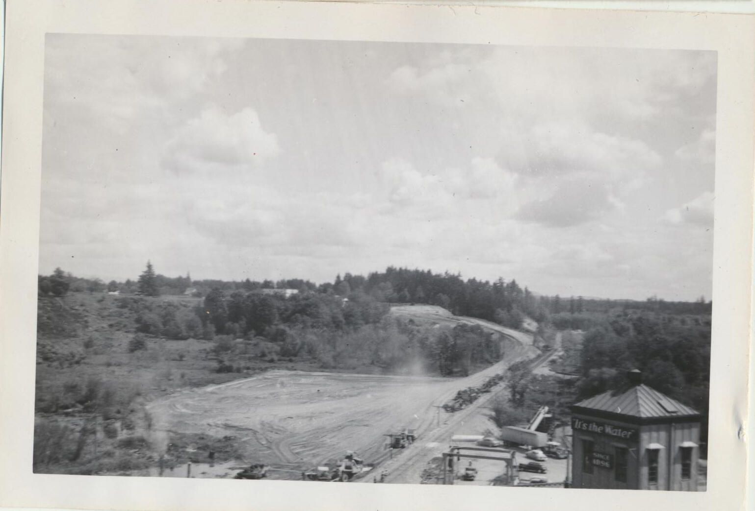 Print, photographic. 5 x 3 1/2 b&w. Construction of can line and warehouse on east side of main brewery and Carlyon Bridge. View of fill site. June 15, 1953.