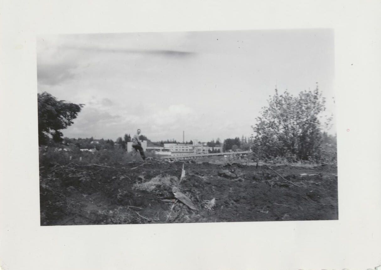 Print, photographic. 4 x 3 b&w. Construction of can line and warehouse on east side of main brewery and Carlyon Bridge. View of point being cleared for moving earth (Chambers Point). May 7, 1953.