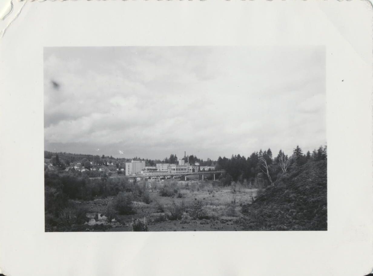 Print, photographic. 4 x 3 b&w. Construction of can line and warehouse on east side of main brewery and Carlyon Bridge. View of brewery from Chambers Point. May 7, 1953.