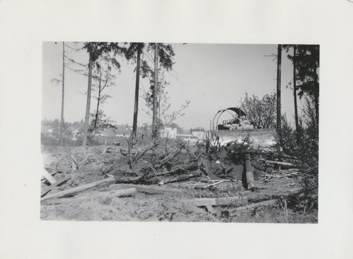 Print, photographic. 4 x 3 b&w. Construction of can line and warehouse on east side of main brewery and Carlyon Bridge. Ground breaking for warehouse fill. Top of point at Chambers Packing. May 5, 1953.Name/Title