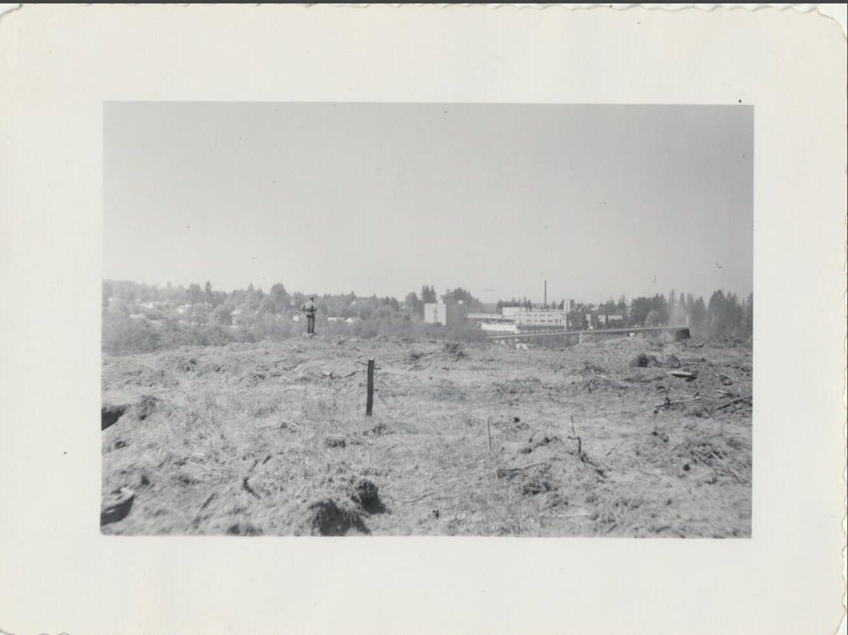 Print, photographic. 4 x 3 b&w. Construction of can line and warehouse on east side of main brewery and Carlyon Bridge. Fill job. Top of hill cleared off. May 11, 1953.