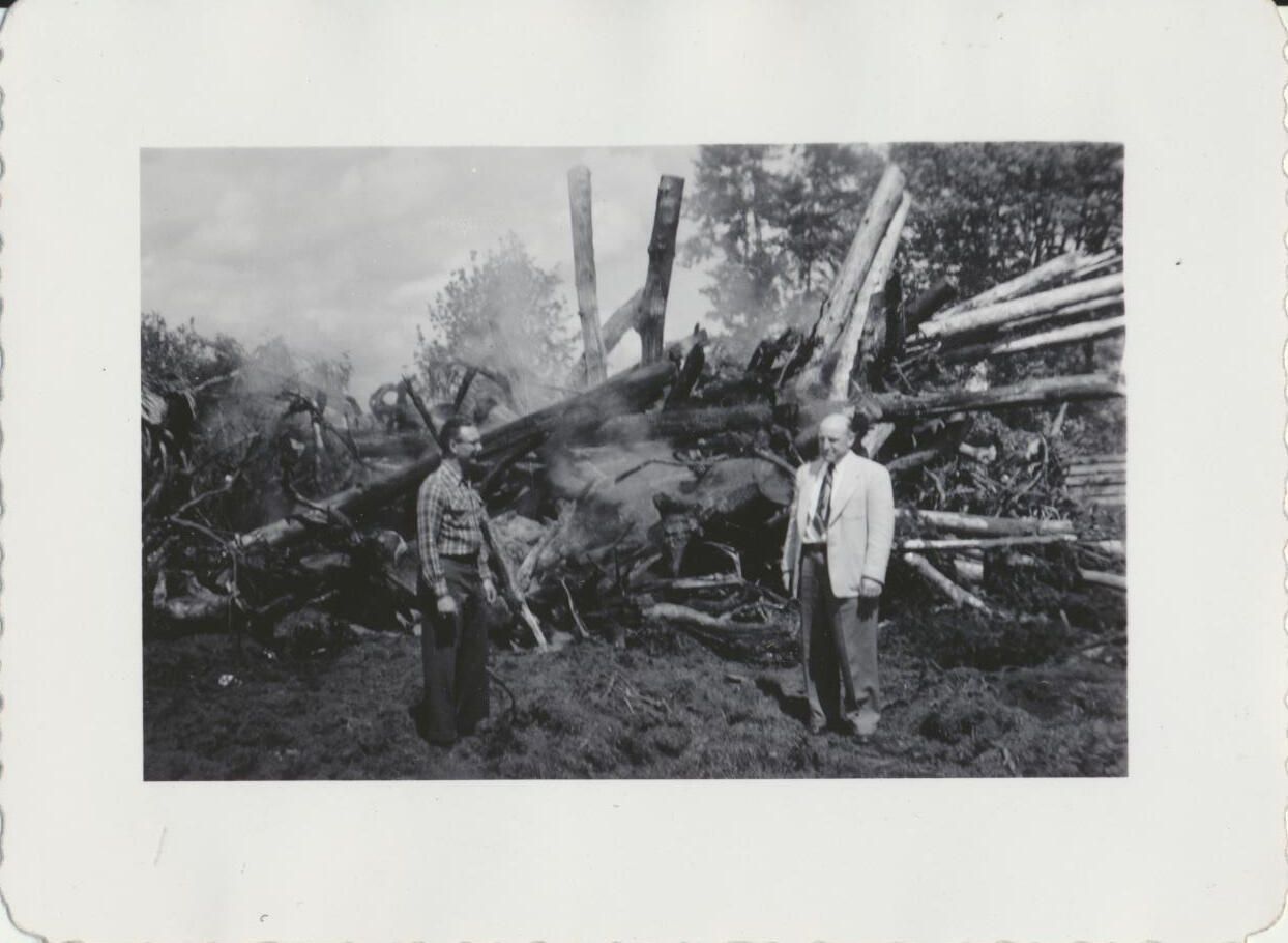 Print, photographic. 4 x 3 b&w. Construction of can line and warehouse on east side of main brewery and Carlyon Bridge. Burn pile on top of hill. Bruce Petrie, Carl Westmoreland. May 7, 1953.
