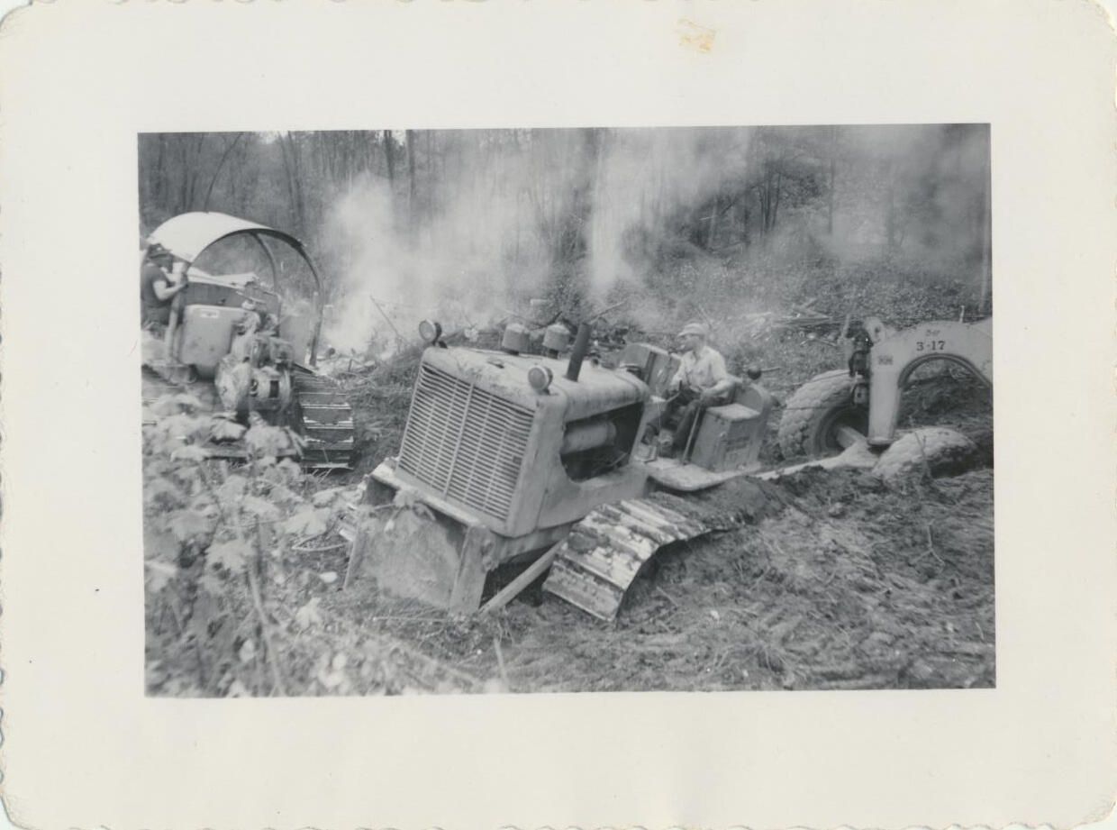 Print, photographic. 4 x 3 b&w. Construction of can line and warehouse on east side of main brewery and Carlyon Bridge. Equipment stuck in dirt. Bill got too close to edge. May 15, 1953.