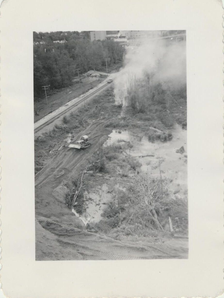 Print, photographic. 4 x 3 b&w. Construction of can line and warehouse on east side of main brewery and Carlyon Bridge. Bill Glover at the bottom of cut. May 14, 1953.