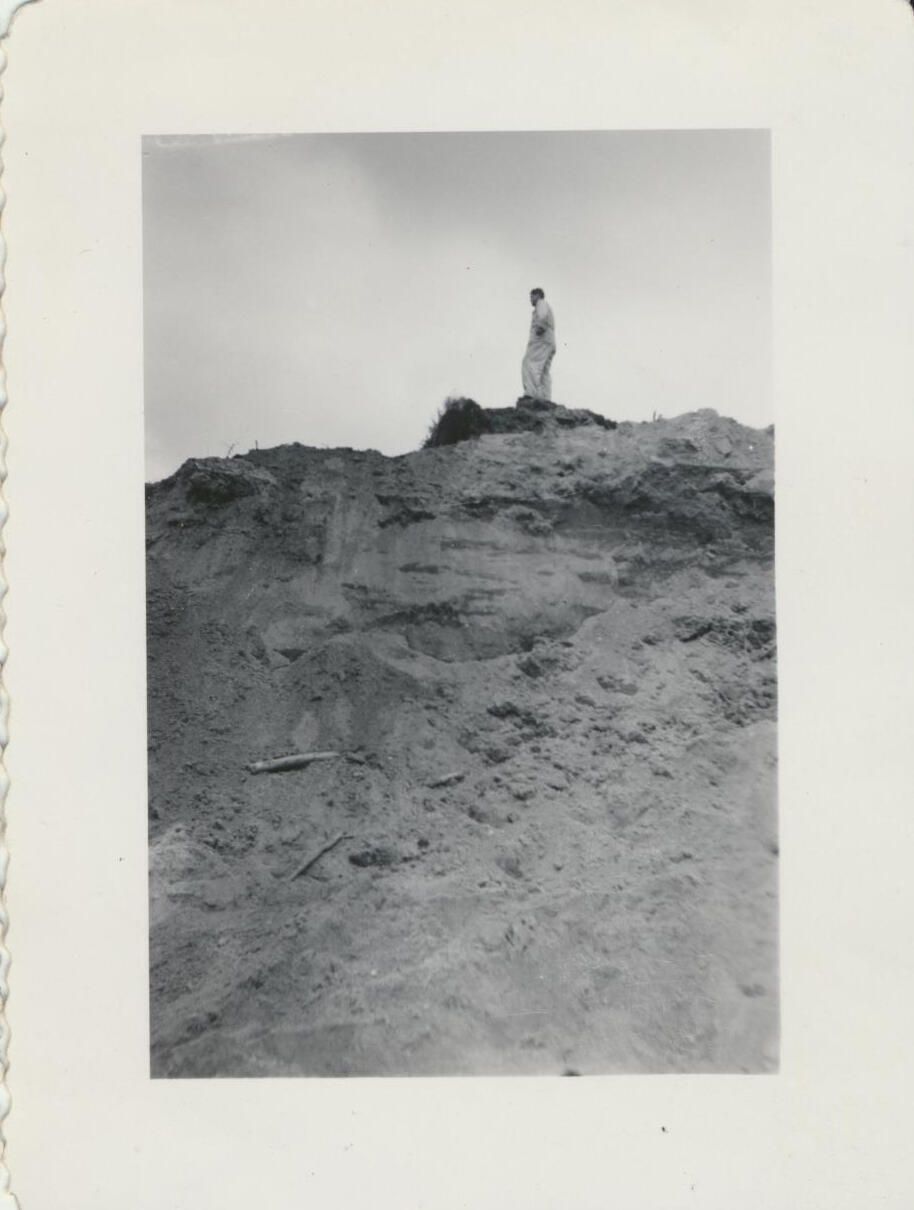 Print, photographic. 4 x 3 b&w. Construction of can line and warehouse on east side of main brewery and Carlyon Bridge. Unidentified man looking over fill. May 15, 1953.