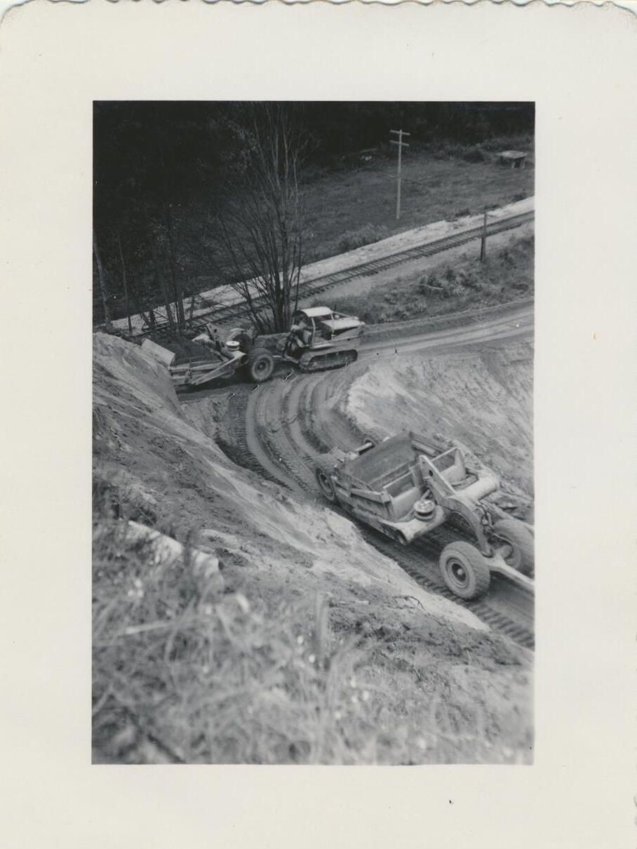 Print, photographic. 4 x 3 b&w. Construction of can line and warehouse on east side of main brewery and Carlyon Bridge. Scrapers making the circuit. May 19, 1953.