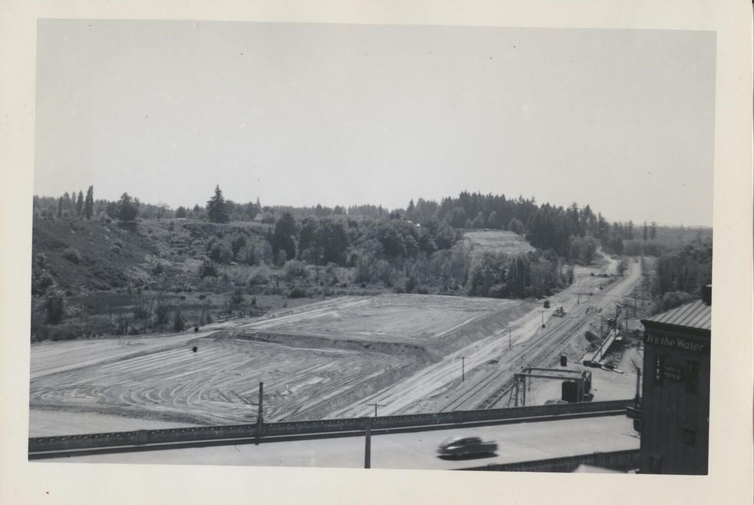 Print, photographic. 5 x 3 1/2 b&w. Construction of can line and warehouse on east side of main brewery and Carlyon Bridge. View of fill job. July 22, 1953.