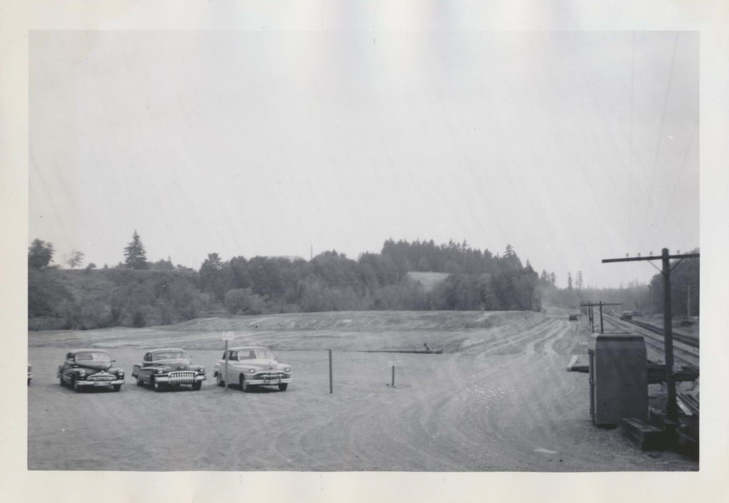 Print, photographic. 5 x 3 1/2 b&w. Construction of can line and warehouse on east side of main brewery and Carlyon Bridge. View of fill job. July 9, 1953.
