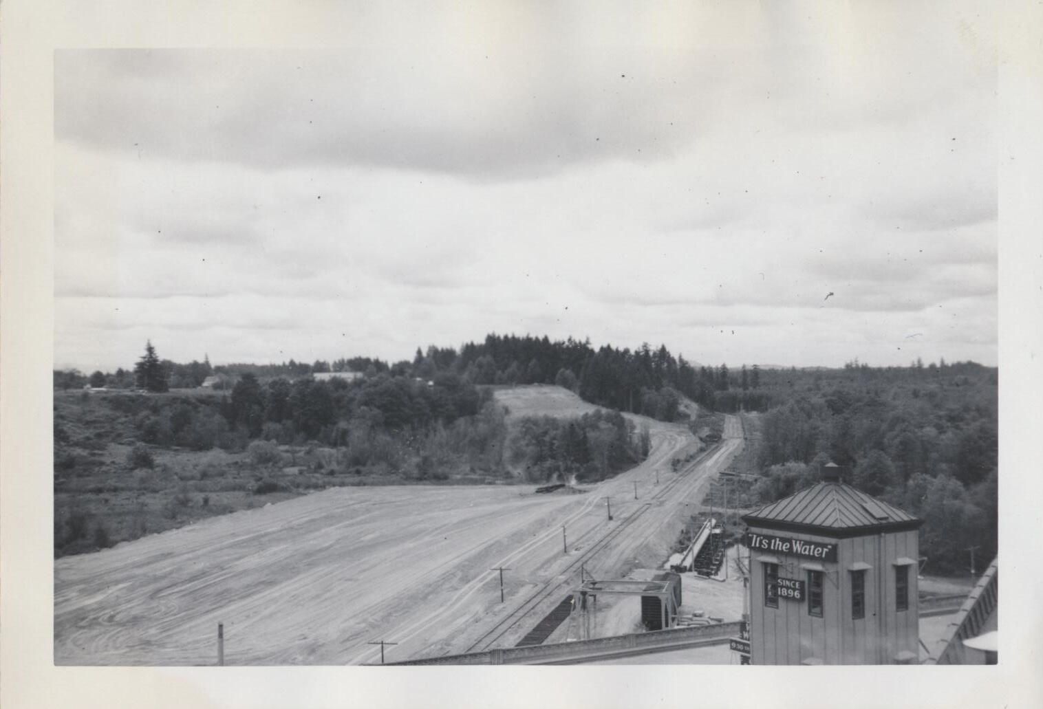 Print, photographic. 5 x 3 1/2 b&w. Construction of can line and warehouse on east side of main brewery and Carlyon Bridge. View of fill job. June 30, 1953.