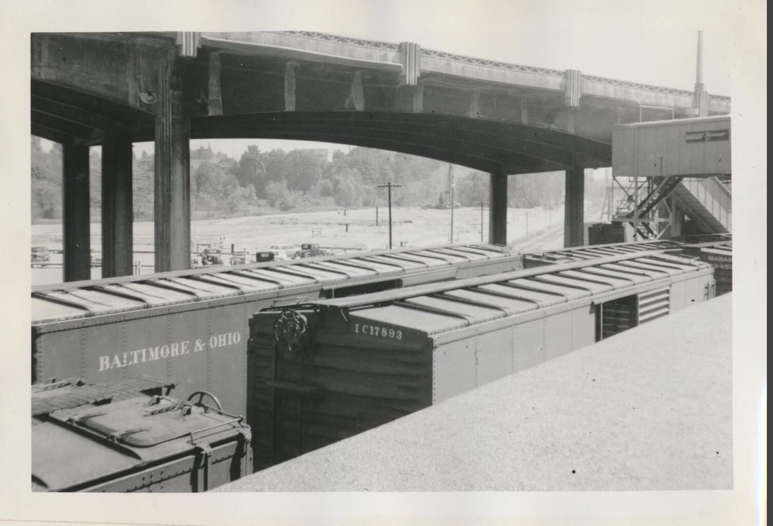 Print, photographic. 5 x 3 1/2 b&w. Construction of can line and warehouse on east side of main brewery and Carlyon Bridge. Hart, first day test pile, with railcars in foreground. July 22, 1954.