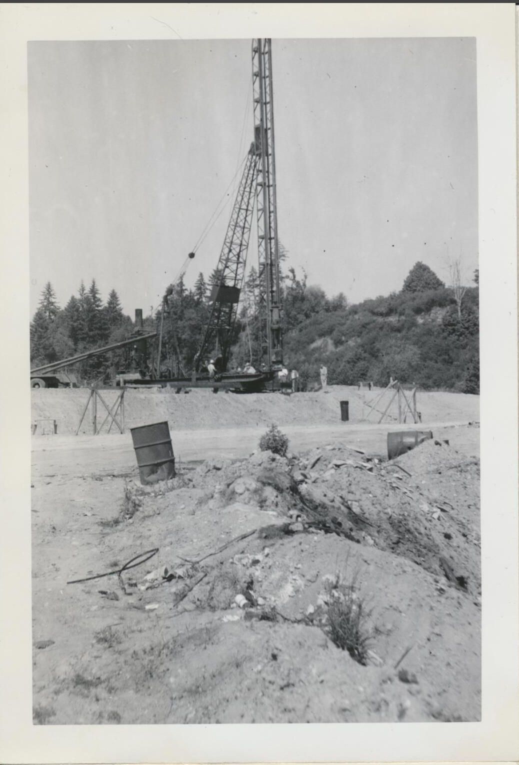 Print, photographic. 5 x 3 1/2 b&w. Construction of can line and warehouse on east side of main brewery and Carlyon Bridge. Hart, first day. July 22, 1954.