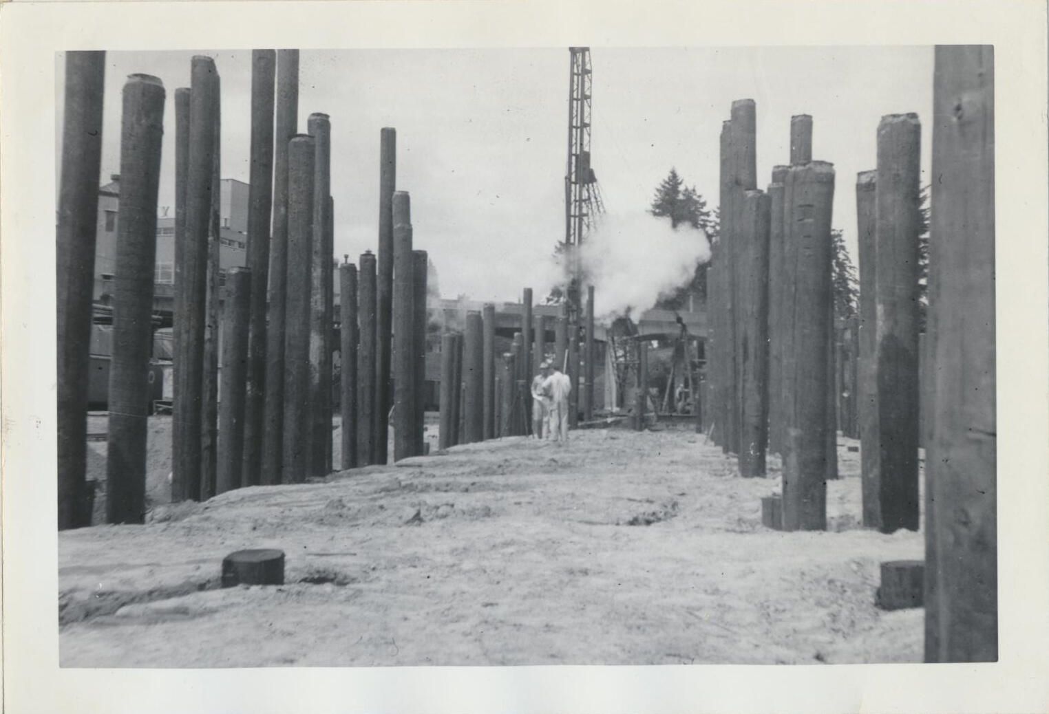 Print, photographic. 5 x 3 1/2 b&w. Construction of can line and warehouse on east side of main brewery and Carlyon Bridge. Piles. Bottleshop. August 17, 1954.