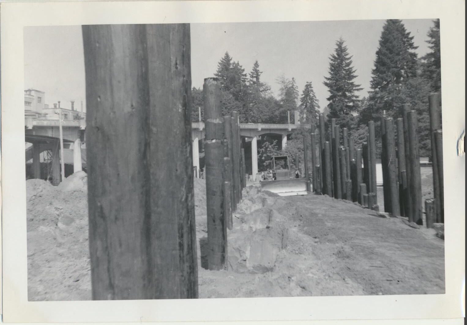 Print, photographic. 5 x 3 1/2 b&w. Construction of can line and warehouse on east side of main brewery and Carlyon Bridge. Piles. Bottleshop. August 25, 1954.