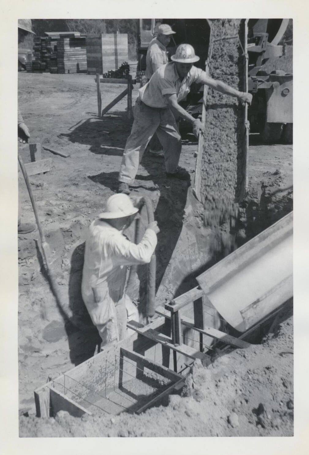 Print, photographic. 5 x 3 1/2 b&w. Construction of can line and warehouse on east side of main brewery and Carlyon Bridge. Footing centerline Y. Warehouse. August 25, 1954.