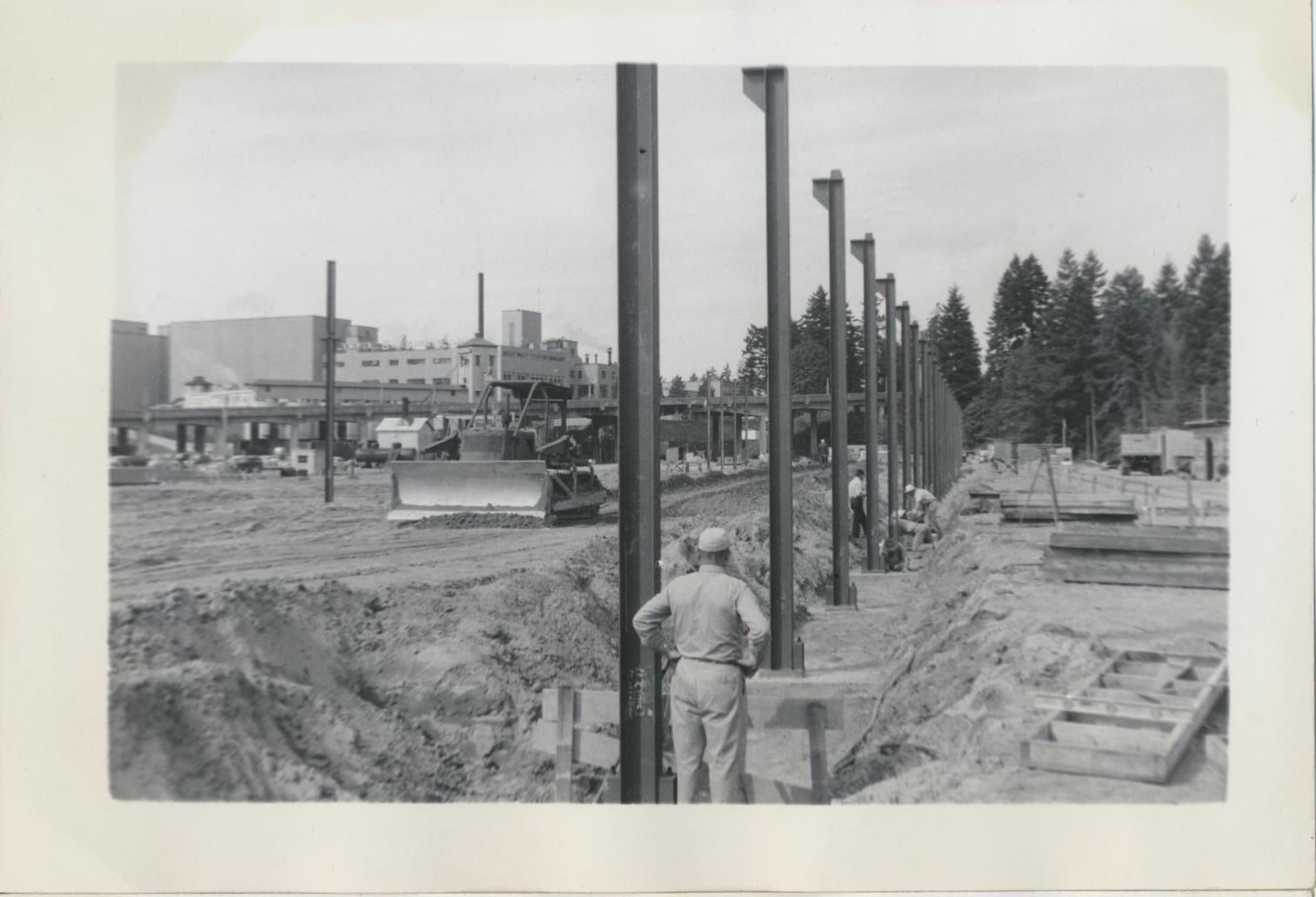 Print, photographic. 5 x 3 1/2 b&w. Construction of can line and warehouse on east side of main brewery and Carlyon Bridge. Ray Linderson. Warehouse. September 15, 1954.