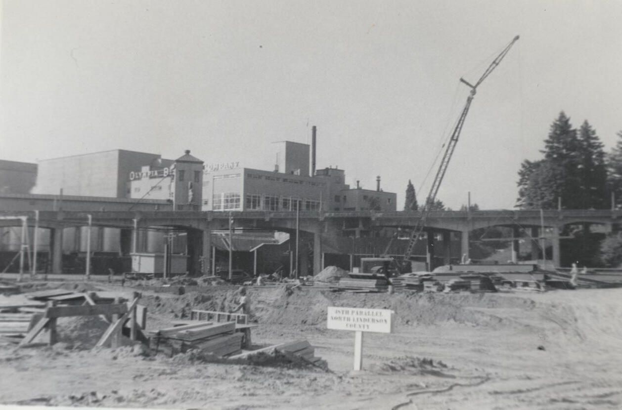 Print, photographic. 5 x 3 1/2 b&w. Construction of can line and warehouse on east side of main brewery and Carlyon Bridge. Crane. September 30, 1954.