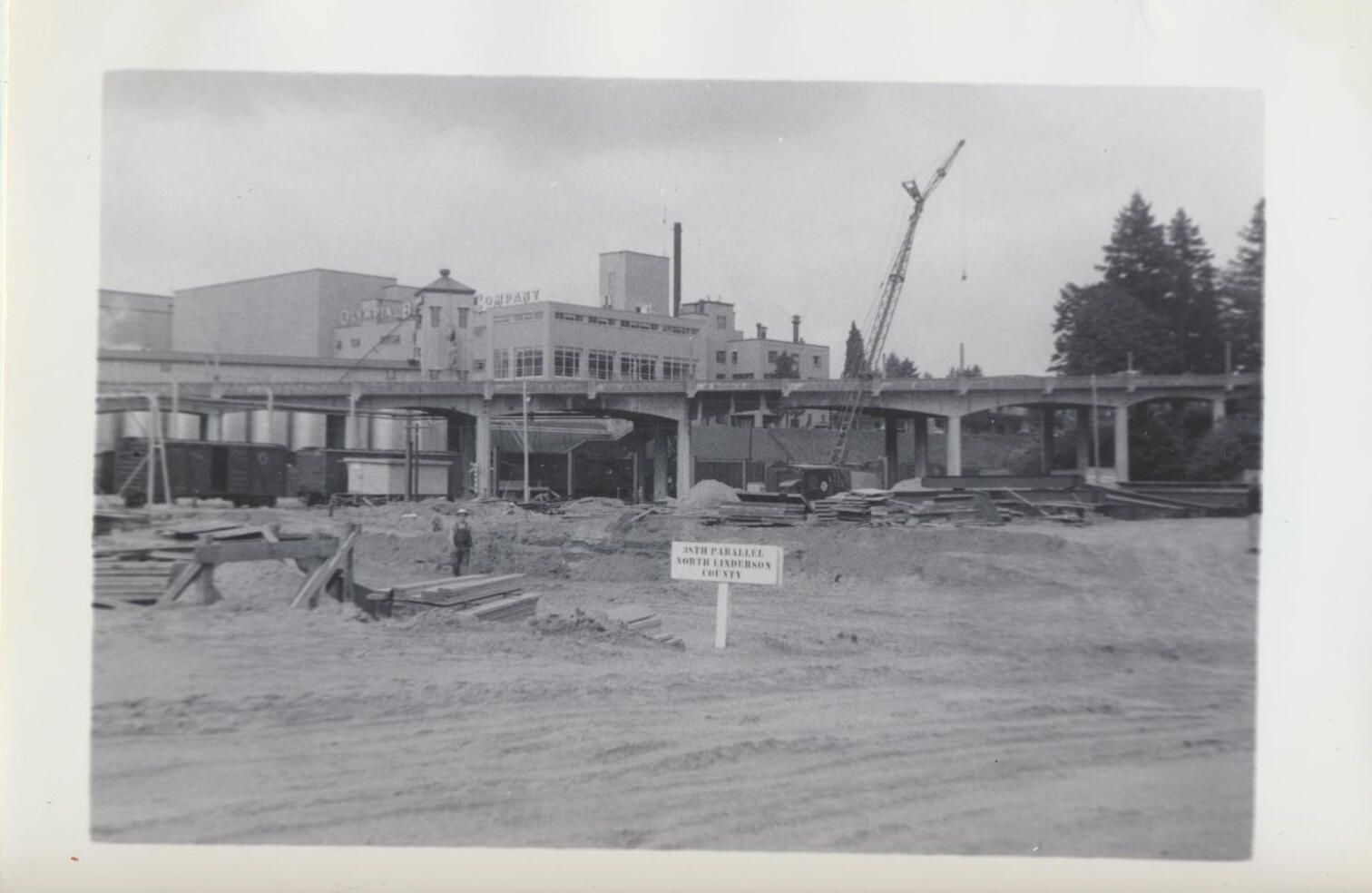 Print, photographic. 5 x 3 1/2 b&w. Construction of can line and warehouse on east side of main brewery and Carlyon Bridge. Crane. September 28, 1954.