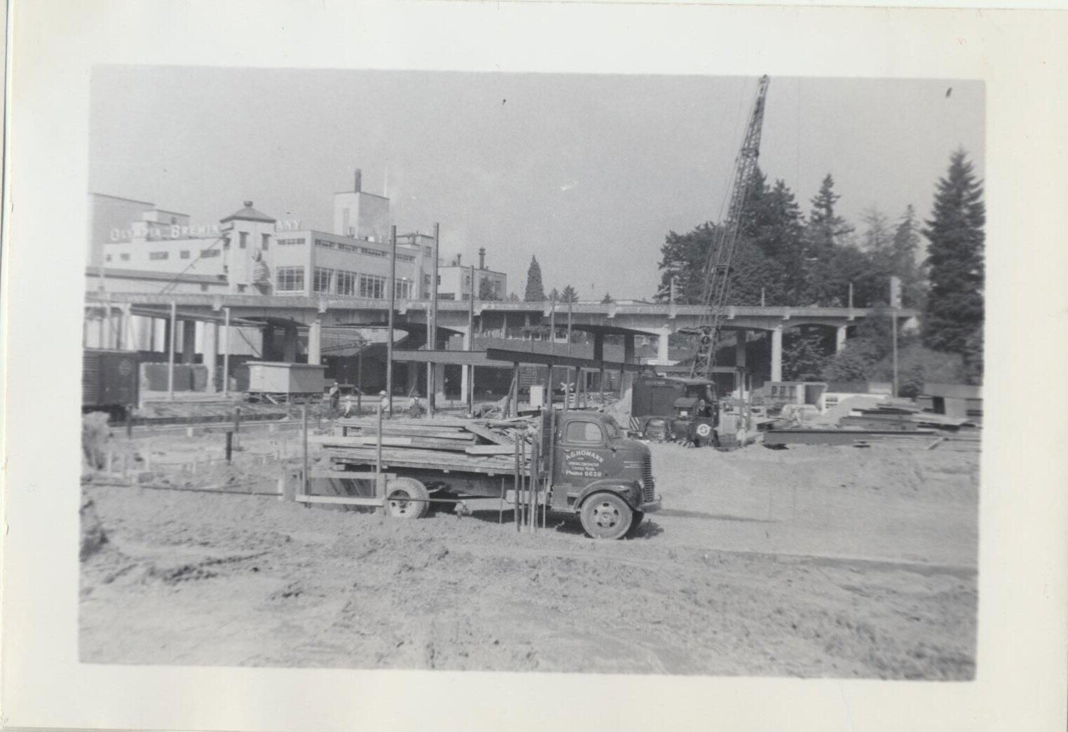Print, photographic. 5 x 3 1/2 b&w. Construction of can line and warehouse on east side of main brewery and Carlyon Bridge. Truck at construction site. October 1, 1954.