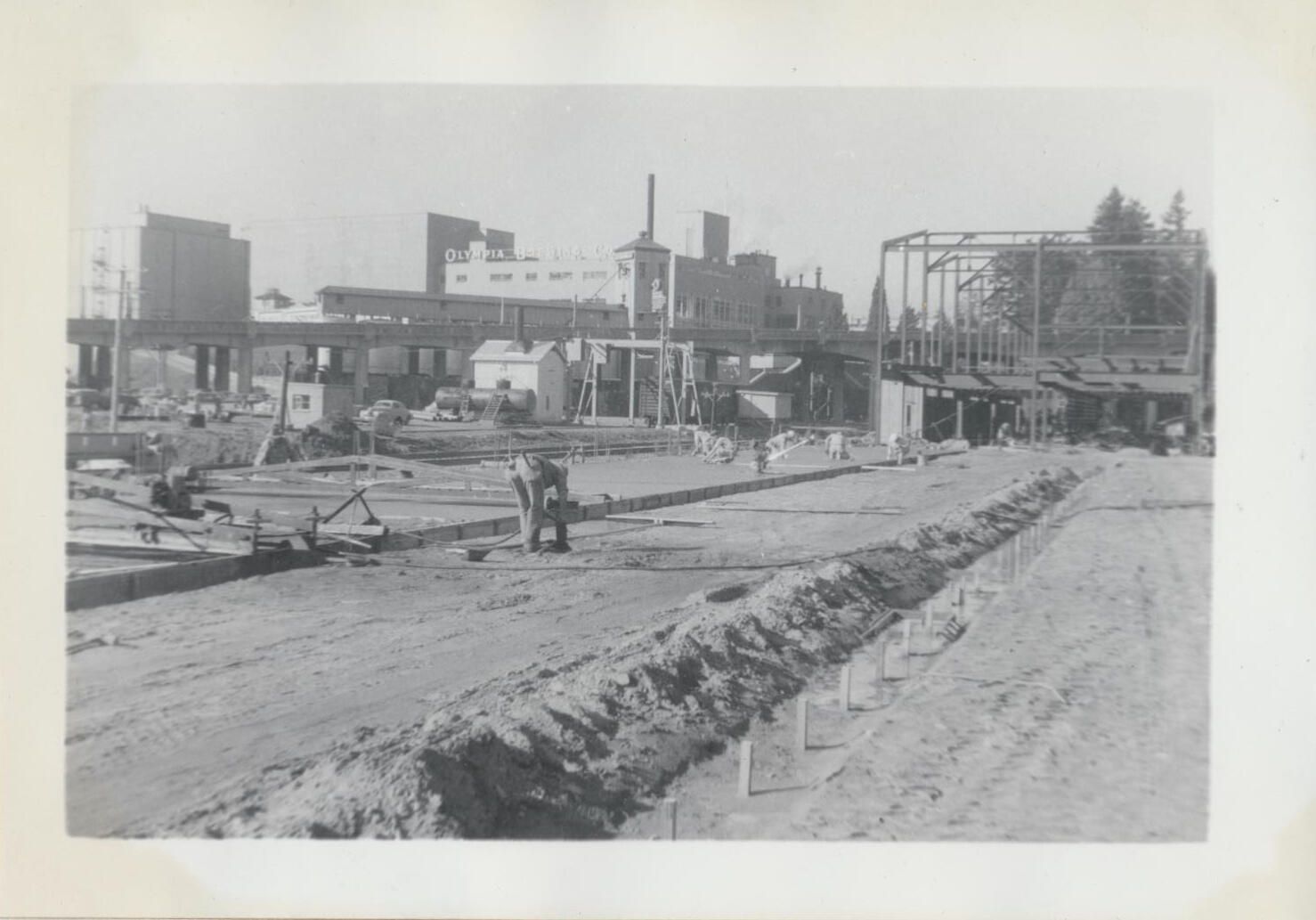 Print, photographic. 5 x 3 1/2 b&w. Construction of can line and warehouse on east side of main brewery and Carlyon Bridge. #1 slab. Small white building just left of center of photo is temporary housing for the boiler. The boiler room was moved from the brewery proper (west side of Carlyon Bridge) to valley floor. October 14, 1954.Name/Title
