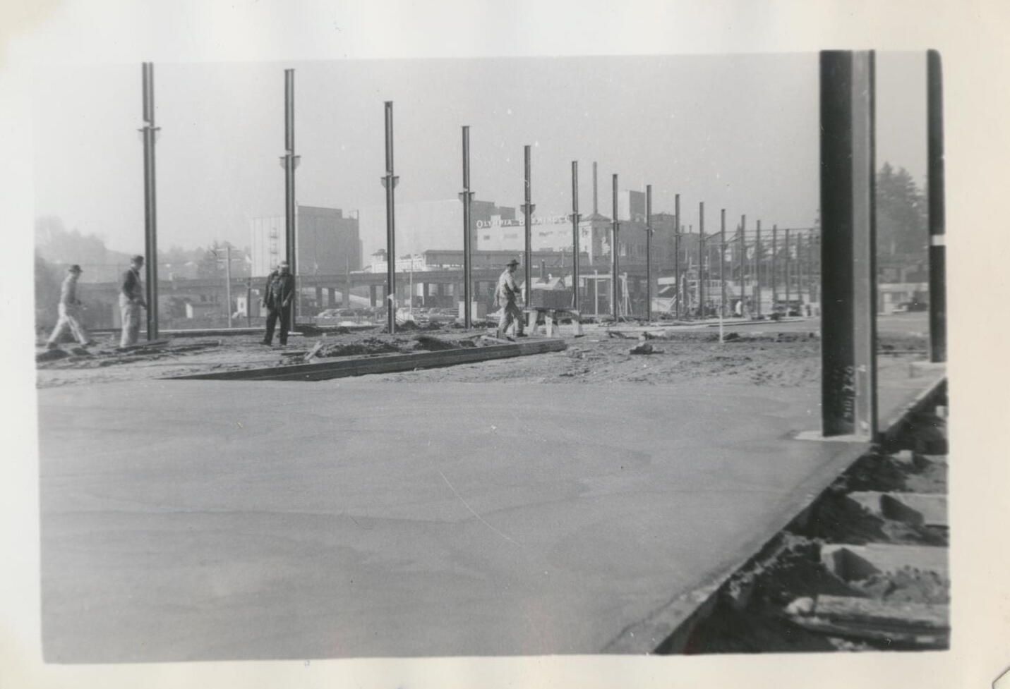 Print, photographic. 5 x 3 1/2 b&w. Construction of can line and warehouse on east side of main brewery and Carlyon Bridge. #1 and 6 hop room. After additional hop rooms were built, rooms were renumbered 1 through 4. October 26, 1954.Name/Title